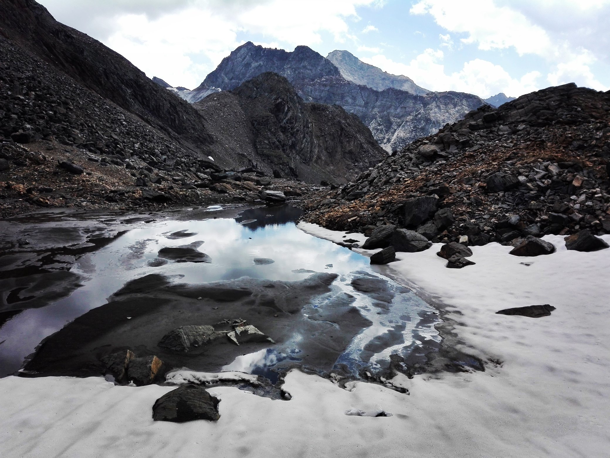 Cestou naspäť dám na rady Cválajúceho Penzistu a v prvom sedle pod Weissspizte neschádzam rovnako, ale bočím doľava, kopírujem značky , ktoré sa tiahnu okolo priľahlého ľadovca Garaneberkees. Prší. To počasie... je nevyspytateľné, ale v tej svojej nevyspytateľnosti je predvídateľné, a preto si vyberám dlhú modrú pláštenku a ako Raťafák Plachta sa nezorganizovanie šmuchtlám pomedzi všetky balvany. Cestou sa udeje ešte veľa príhod, ale to by bolo písania do neskorého večera. Gravitačná a časová tiaž ma za krídla ťahá dole. Ani neviem ako, ale ocitám sa pred plesom Eisee. Tu na chvíľku postojím. Je to malý šok, hlboké oko doliny vytryskujúce spomedzi mlčanlivej obruče kameňov... a to oko pozerá.. hlboko do mňa. Tie Alpy....