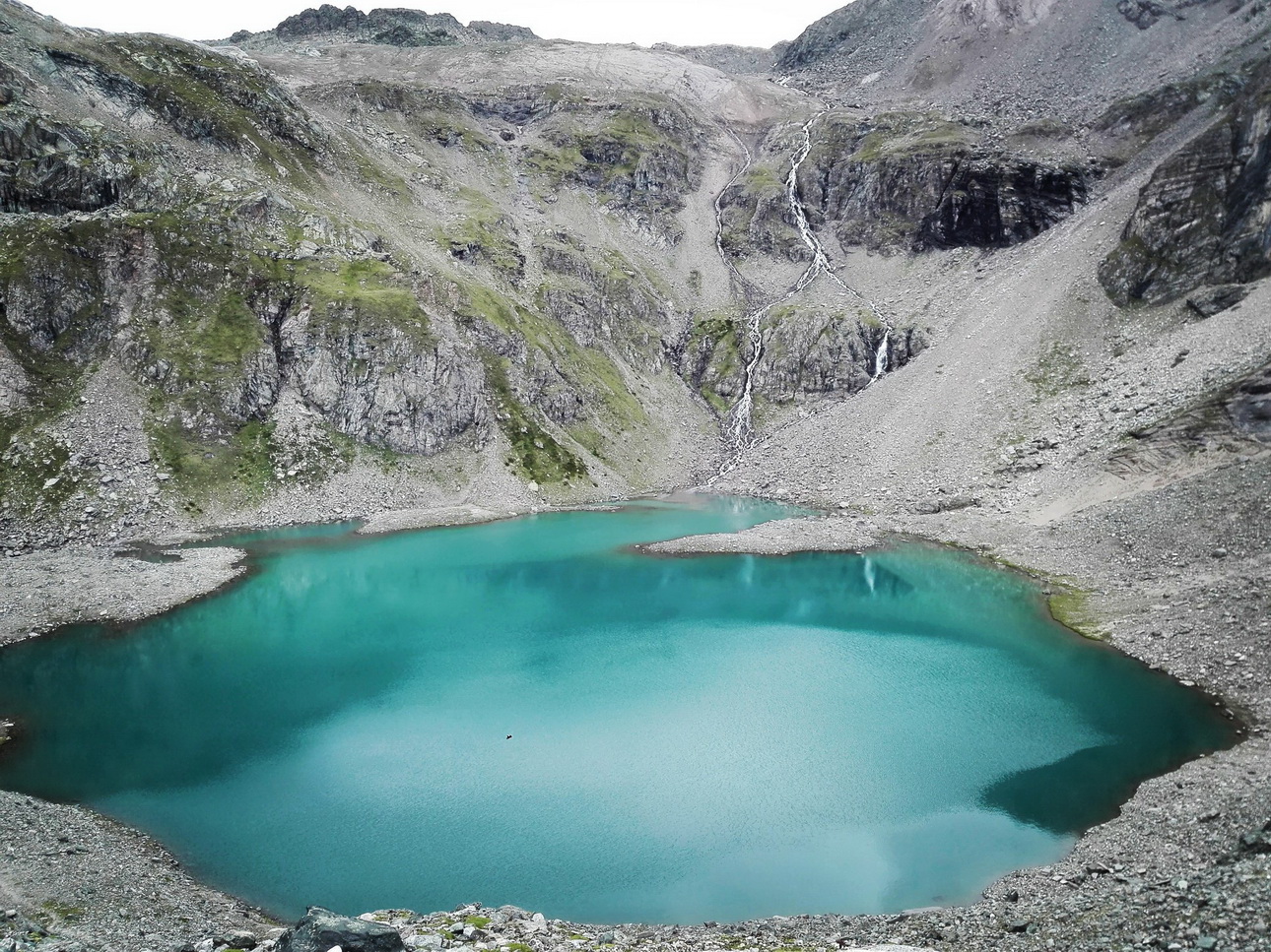 Vždy je to iné ak je v doline potok. Počuť v ňom tlkot, rytmus, radosť, ľahkosť z nejasného smerovania napriek prísnym pravidlám gravitácie. Po pravej strane ešte v neprebudenom tieni obchádzam Wallhorn Alm, horský statok s troma prebudenými mužmi. Tu nezobúdza slnko, ale povinnosti... Z doliny vidím Eisseehütte. Je na dosah ale predsa, odcupitať pár výškových metrov s estetickým vodopádom a križovaním strán, to chvíľku trvá. Je 9:45 a časovo netuším, či idem podľa plánu, lebo žiaden nemám.