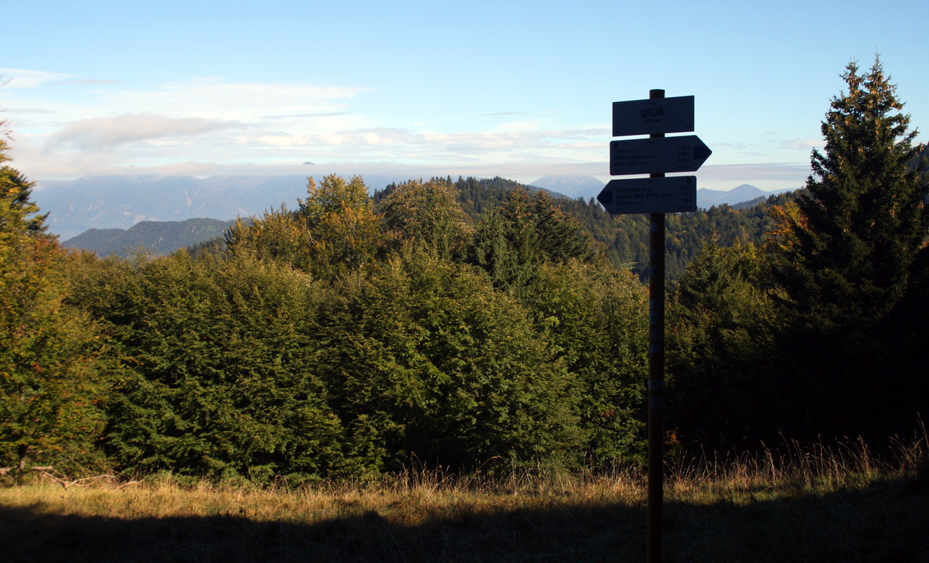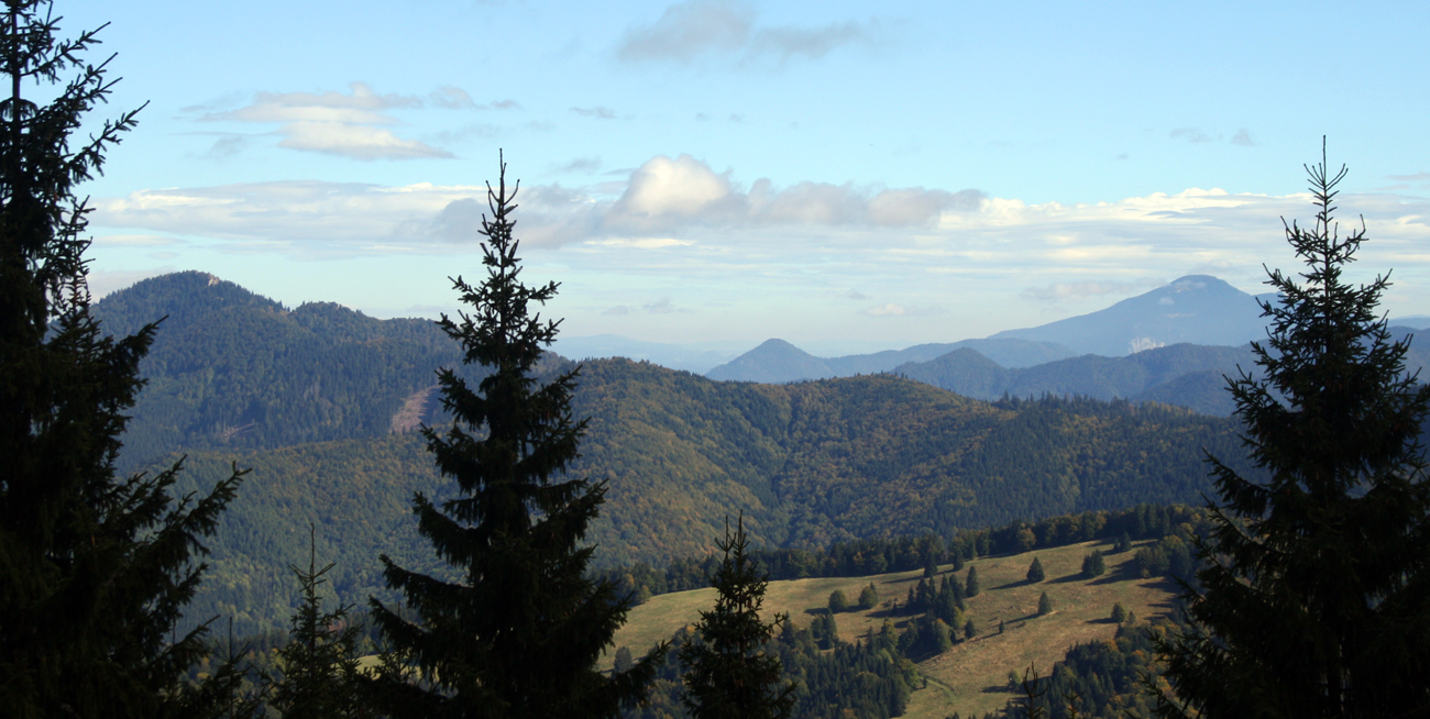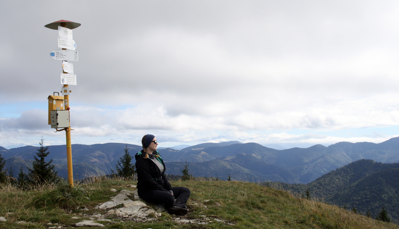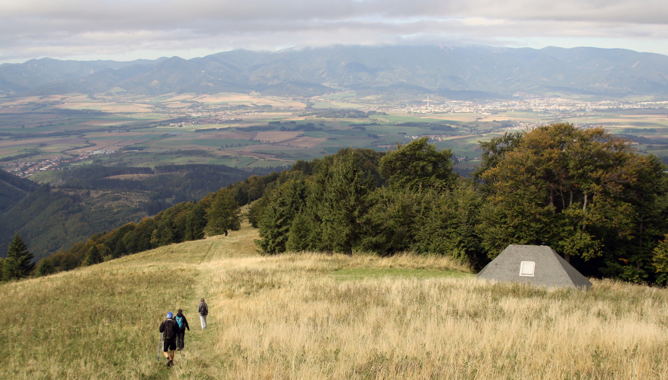Asi v polovici výstupu vyliezame spod korún stromov na zarastajúce lúky - pribúdajú výhľady do diaľok, ukazuje sa Kľak, Choč, vzadu Martinské hole a tak... Auto sa kúsok pod vrcholom otočilo, asi boli poľovníci po dákeho picnutého zvera. Ani dve hodky nám to netrvalo a sme hore. Trochu fučí, slnko len chvíľami vylieza, svetlo také šedivé, ale mraky vysoko, vidno ďaleko. Pomrvíme sa okolo smerovníka a zima nás poháňa dole. Teraz pre zmenu po žltej, tade je zostup krajší, s výhľadmi do kotliny priamo pred nosom.