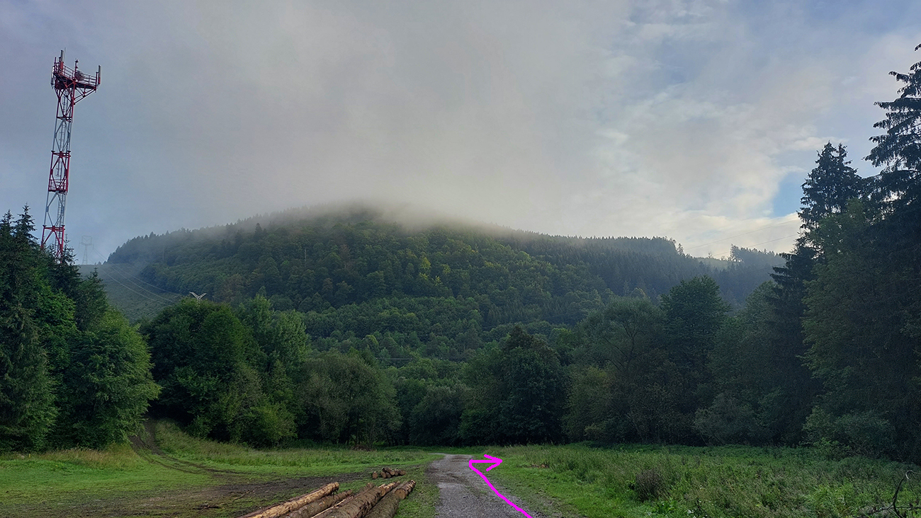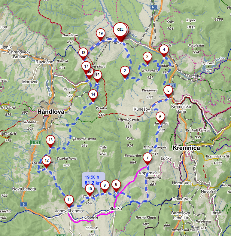 Na výročie SNP sa dusné a horúce počasie odporúčalo konečne „do preč“ a nastalo teplotne príjemné, aj keď podmračené ráno, zato s perspektívou vyjasňovania. Tak som tiež povstal a ušiel som do hôr, ako kedysi partizáni. Symbolicky vlakom do Skleného na juhu Turca - tam a v okolí je povstalecká história stále živá a jej tamojšia najznámejšia udalosť bola dokonca dlho zamlčiavaná, lebo nepasovala do ideologického profilu SNP. Ale teraz to bolo o inom: konečne po dlhšom čase na horskom bajku, lebo v horúčavách ma ťahá viac na asfalt. Vymyslel som si preto okruh so začiatkom aj koncom v Sklenom, ponad Kremnicu a Handlovú, v najvýchodnejšej časti Kremnických vrchov, okolo kopčekov, ktorým dominuje Vysoká hora (909 m). Skoro tak, ako ukazuje mapa, len v južnej časti oproti plánu trochu zmena, tú ukazuje fialová čiara (zdroj: Mapy.cz):