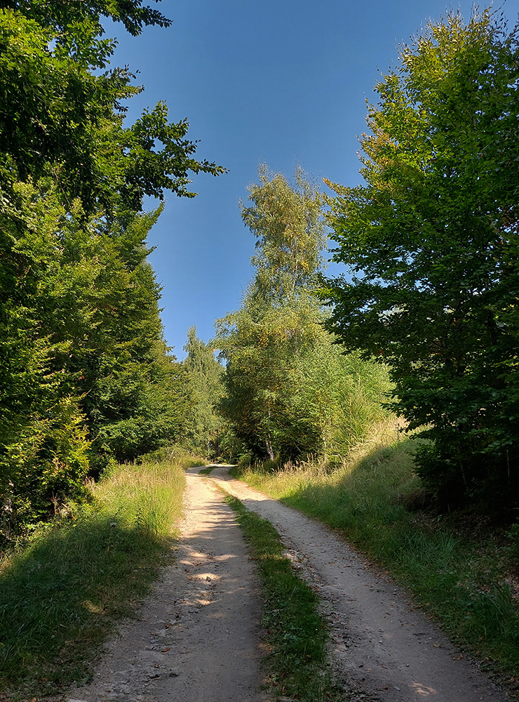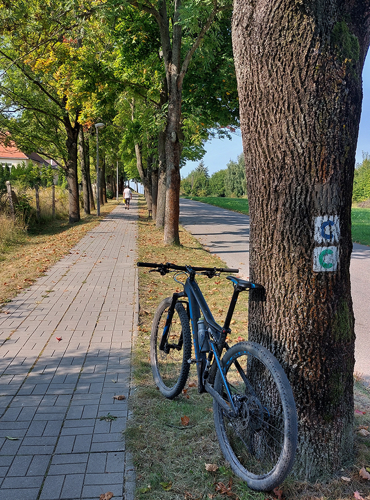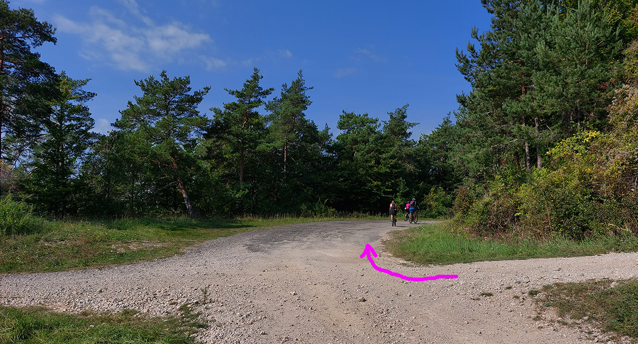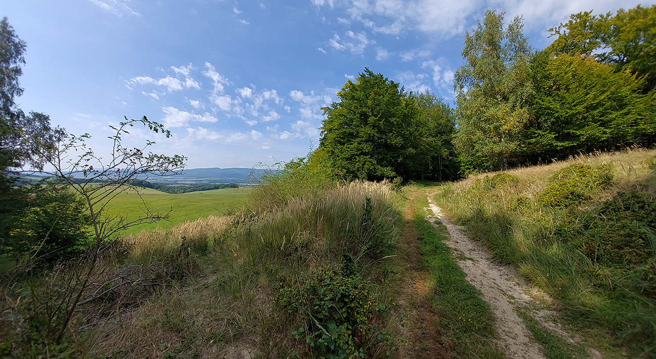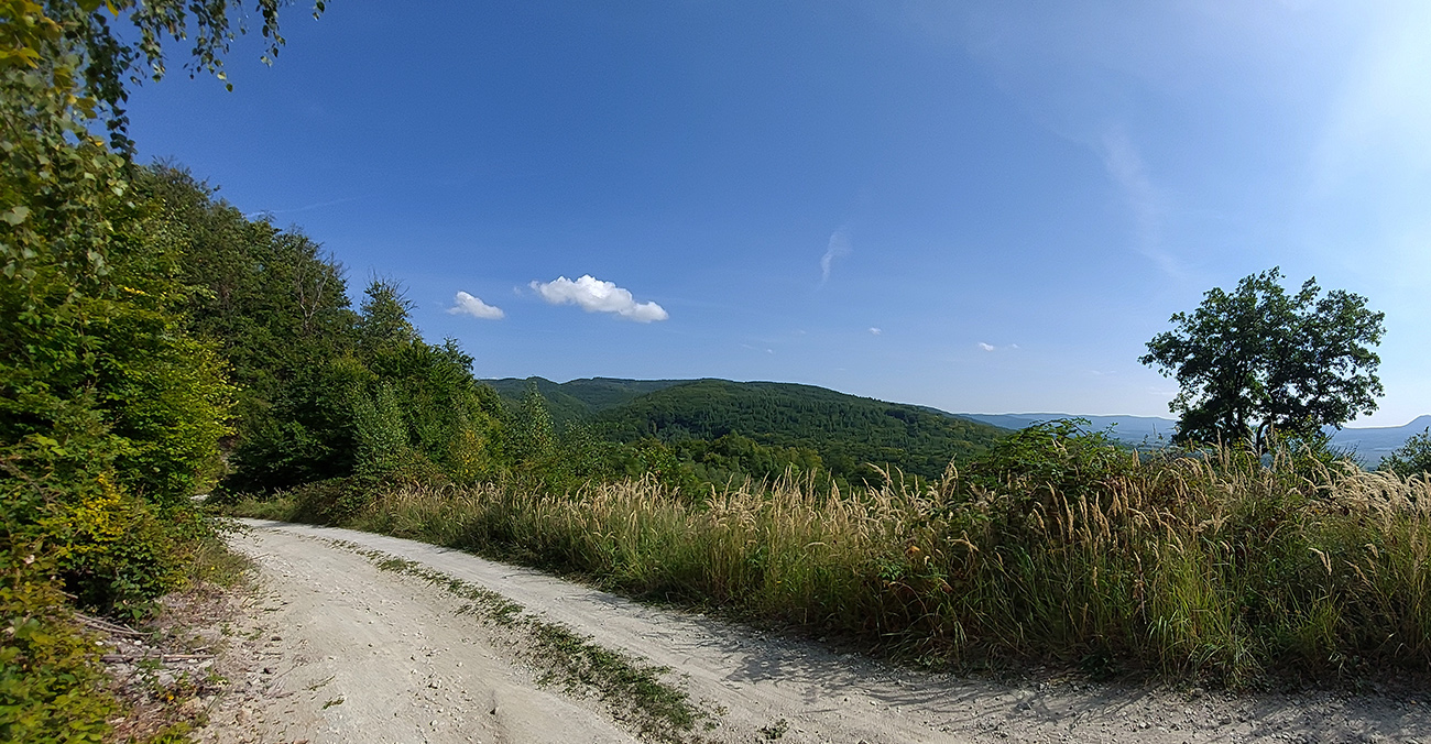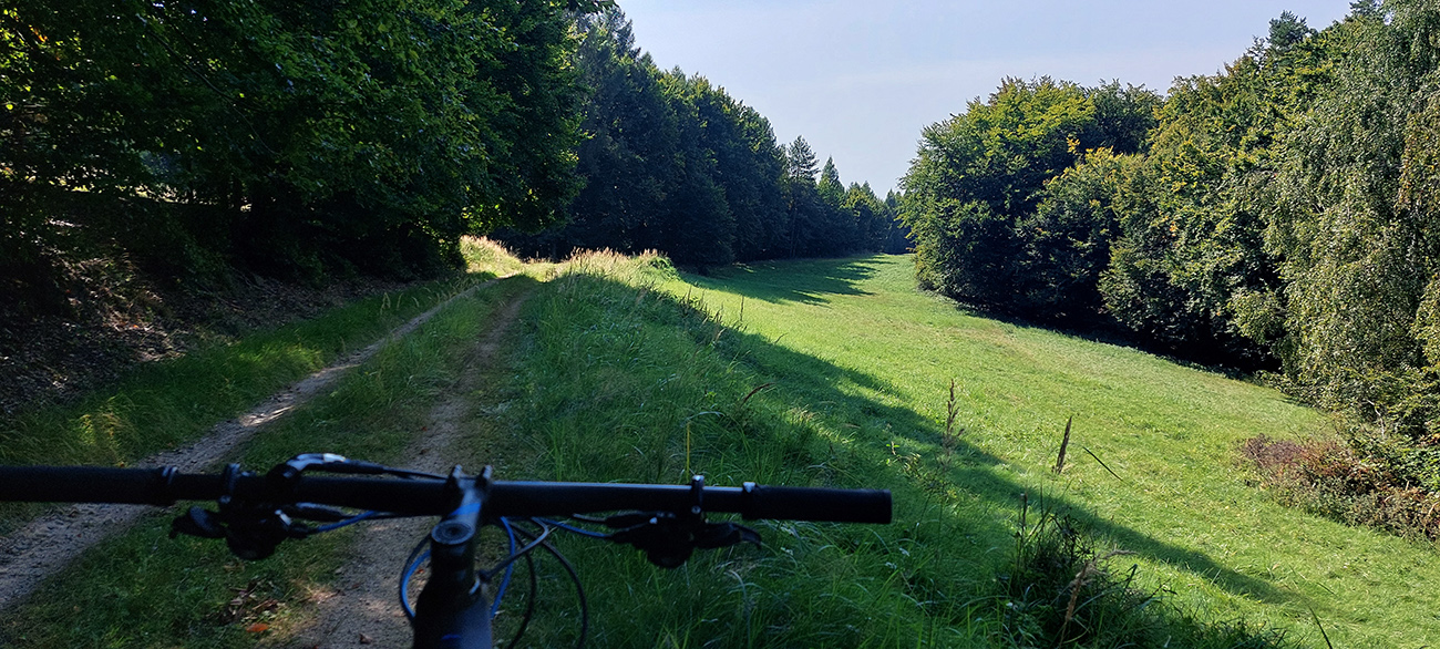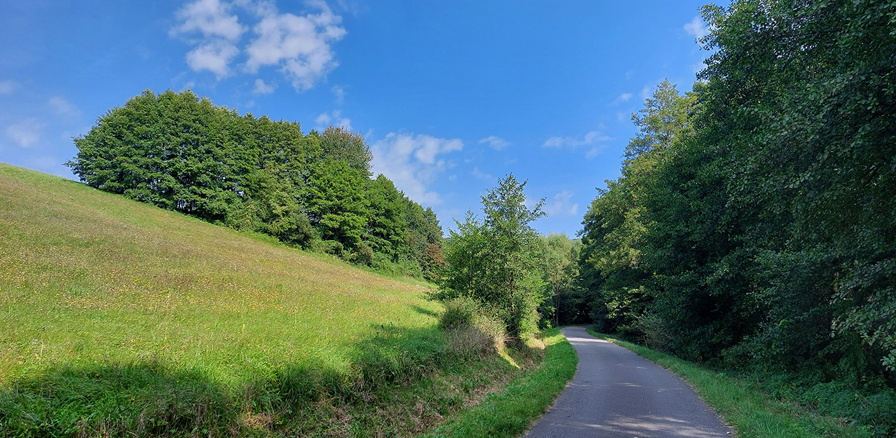 Je to poriadna cyklomagistrála – široká, so starým, rozmrveným asfaltom, kde som bol vďačný za celopéro. Lebo je aj rýchla, v mojom smere smerom na severozápad prevažne z kopca. Sem – tam aj šotolina, ale najmä príjemný tieň, početné odbočky hore do lesa aj dole na lúky a do dedín v doline – tu by sa teda dalo poriadne dlho blbnúť a objavovať. V podstate stále vedie tá cesta rozhraním lesa a lúk, takže za výhľadmi stačí odbočiť pár metrov. Veď aj výletníkov na bajkoch som stretal často.