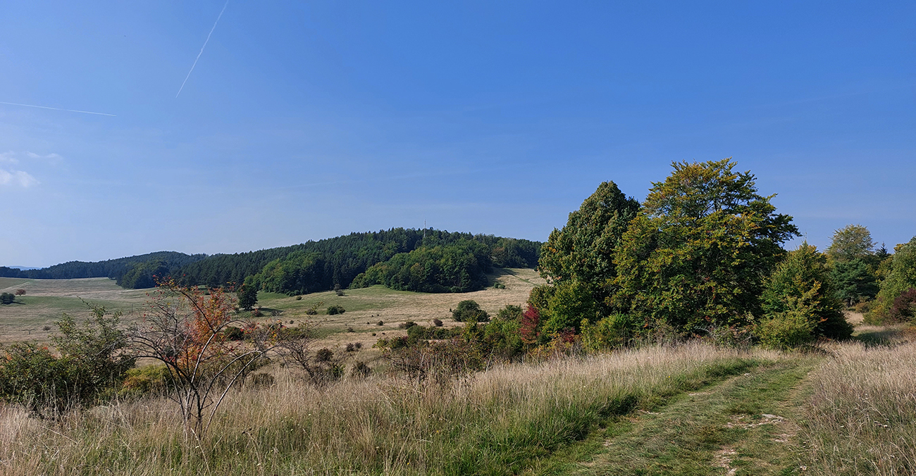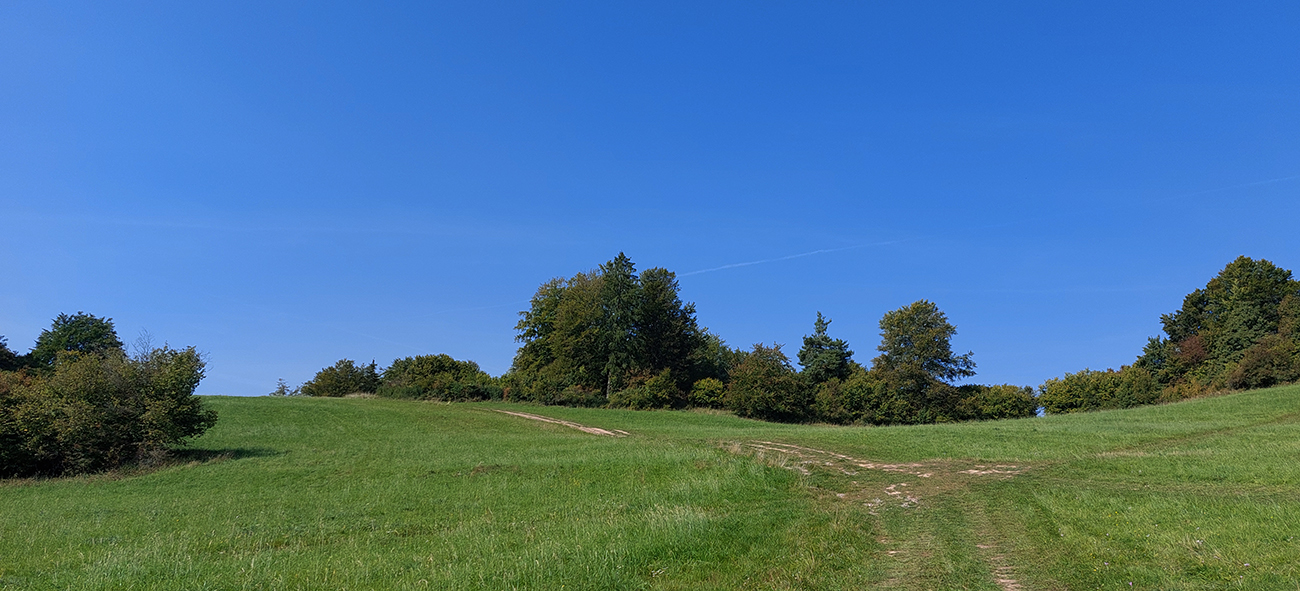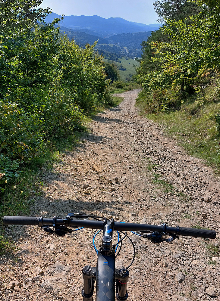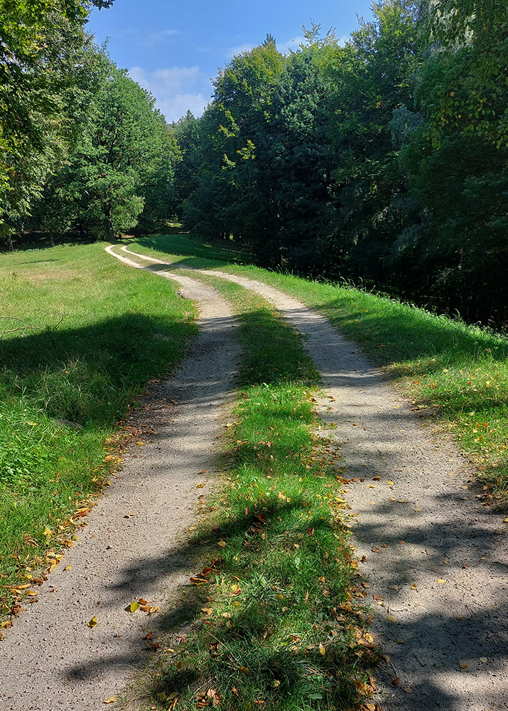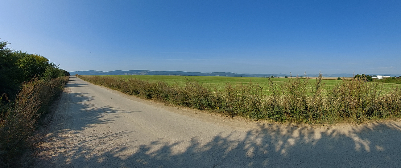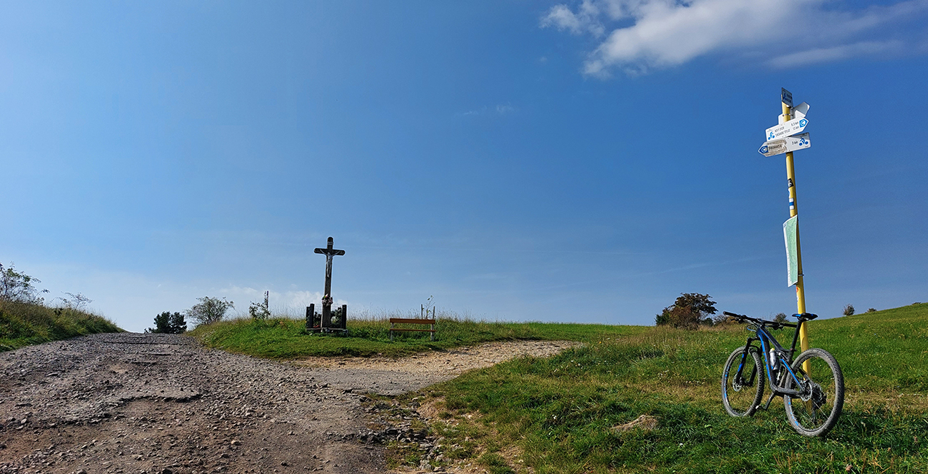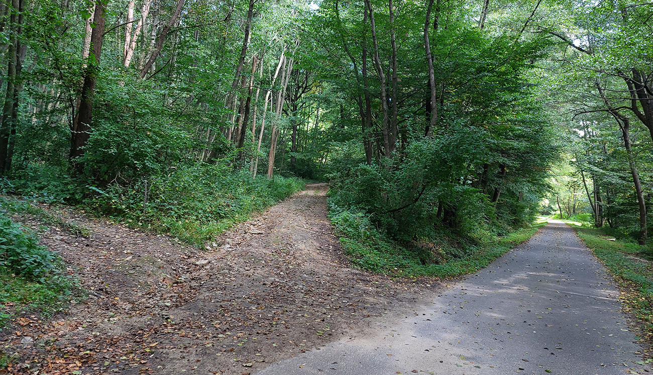Je to poriadna cyklomagistrála – široká, so starým, rozmrveným asfaltom, kde som bol vďačný za celopéro. Lebo je aj rýchla, v mojom smere smerom na severozápad prevažne z kopca. Sem – tam aj šotolina, ale najmä príjemný tieň, početné odbočky hore do lesa aj dole na lúky a do dedín v doline – tu by sa teda dalo poriadne dlho blbnúť a objavovať. V podstate stále vedie tá cesta rozhraním lesa a lúk, takže za výhľadmi stačí odbočiť pár metrov. Veď aj výletníkov na bajkoch som stretal často.