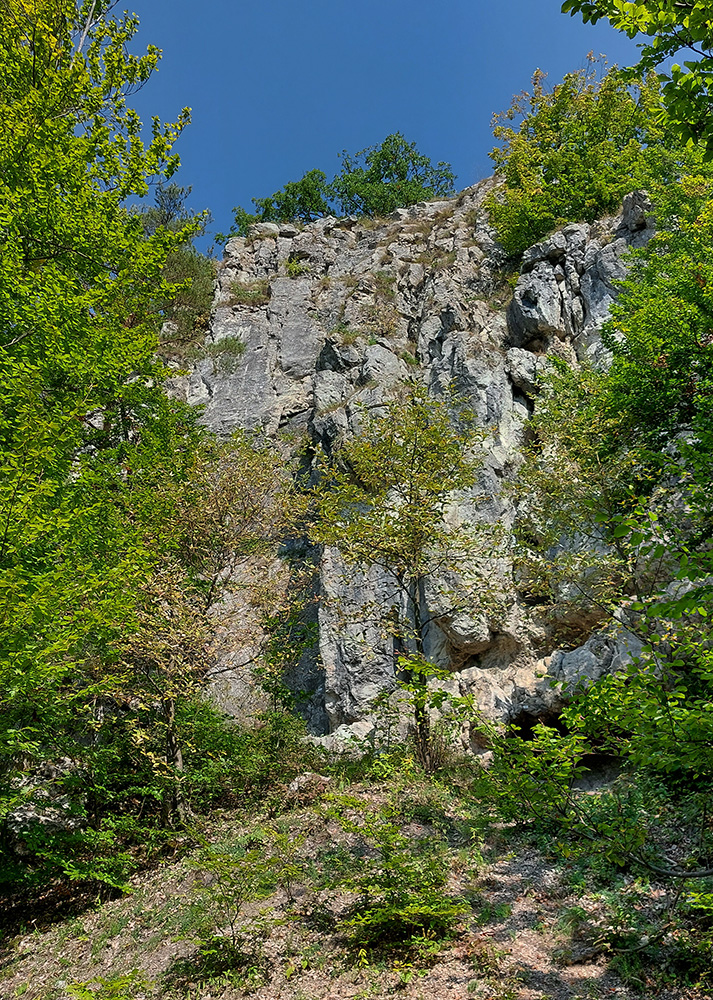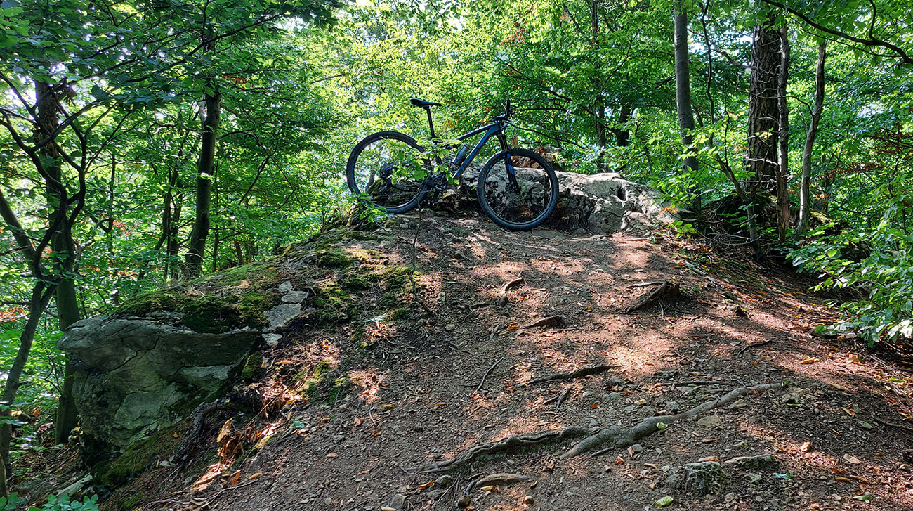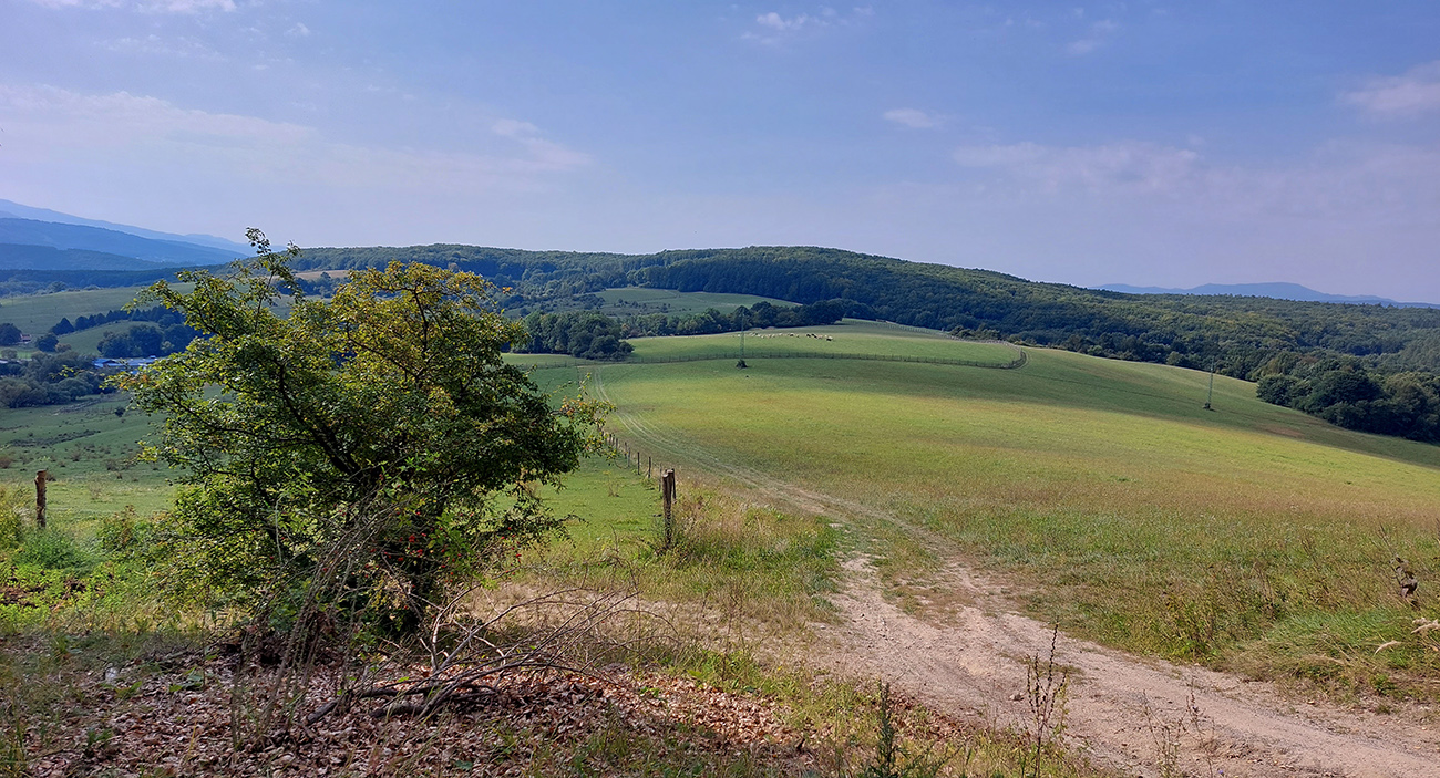 Prechod na šotolinu a hlinu na modrej značke, krásny pojazd pomedzi farebné solitéry, lúky a krovité remízky a rýchly zošup na vyhliadku z Hájskej skaly. Hlasy zdola doliehajúce svedčili o tom, že sa tu aj lezie. Po vyobzeraní výhľadov do sýtosti som modrú turistickú značku na chvíľku opustil, aby som si skalu obzrel aj zdola (parádna, bajkovateľná cesta vedie popod), a potom už som sa krátkym, strmším, hrboľatým zjazdíkom napojil na cyklotrasu z Rematy do ústia Kostolnej doliny (Bojnický cyklookruh, modrá 2308). Tá ma sem vlastne pritiahla najviac, lebo v mape nie je možné nevšimnúť si ju.