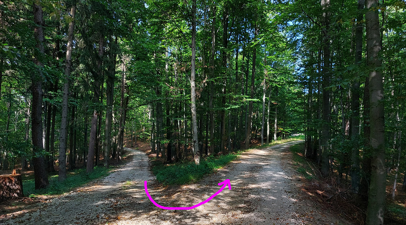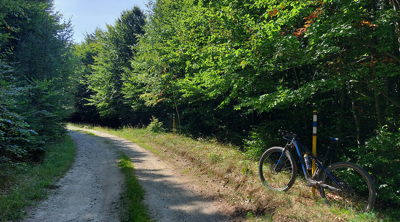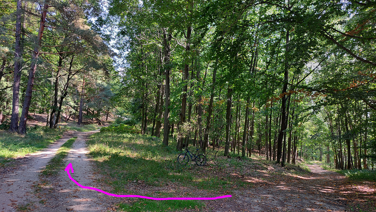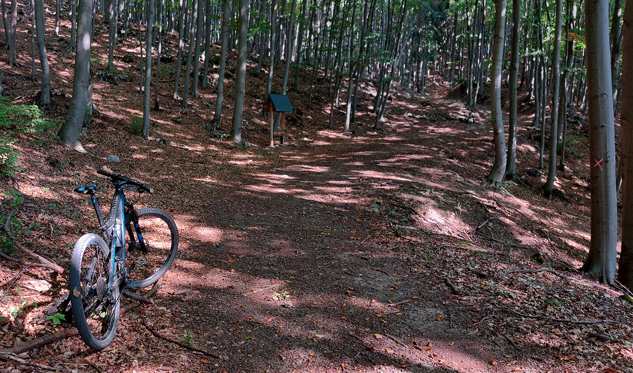 Zelenú a dve susedné modré turistické značky (vedúce z Nedožier a z PD hore na hrebeň) poznám, aj tie ma navnadili prísť sem na bajku, ale tentokrát bol zámer len ich prekrižovať traverzami tam aj nazad. Takže najskôr zo zelenej na sz na modrú, kúsok hore po modrej a sponad smerovníka Zákľuka nazad na zelenú (na Urbársky pasienok), len na „vyššom poschodí“. Mapy.cz tie cesty ukazujú ako nespevnené, ale sú to parádne lesné cesty, pod kolesami biely piesok, no čistá radosť.