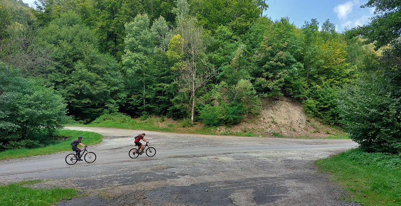 Rovnaké scenérie a rovnaká kvalita ciest sa potom opakovali aj ďalej, od serpentíny a konca asfaltu v Kostolnej doline cez križovanie ďalšej modrej značky (Pod Medzníkom) a ponad Čausiansku dolinu až na hrebeň Žiaru. Niekomu by sa to zdalo možno jednotvárne či málo technické jazdenie, lebo je to len nekonečné dupanie lesom po rovných cestách s neveľkým sklonom. Len málokde som sa musel viac „kusnúť“ do strmšieho alebo viac pribrzdiť z kopca po rozbitejšom. Veď aj tie fotky sú jedna ako druhá, že? :-) Ale na pohodové jazdenie ideál.