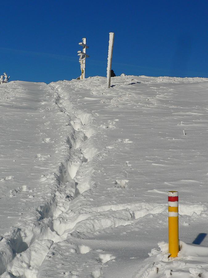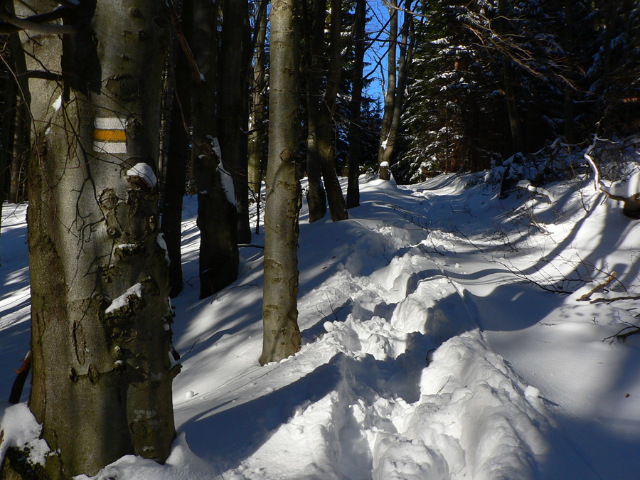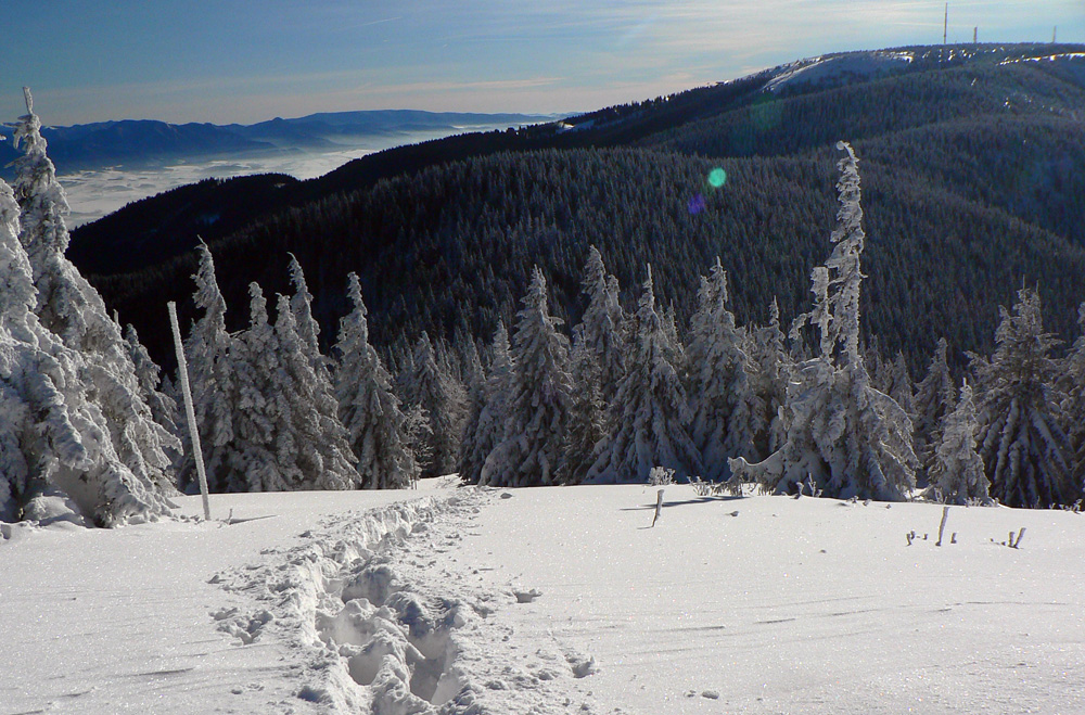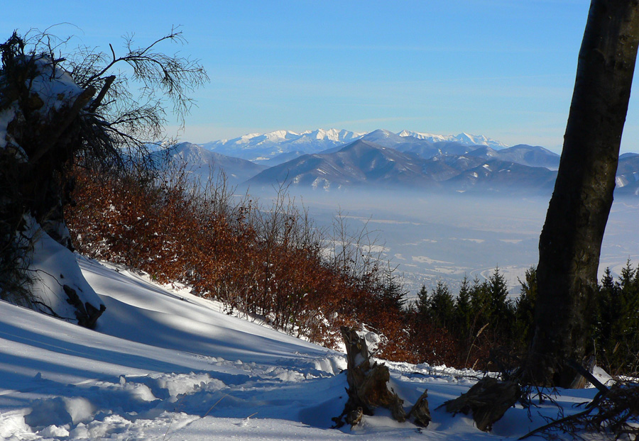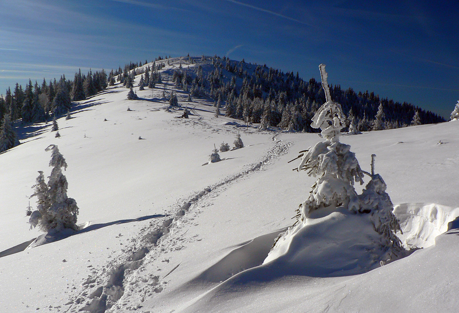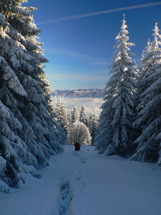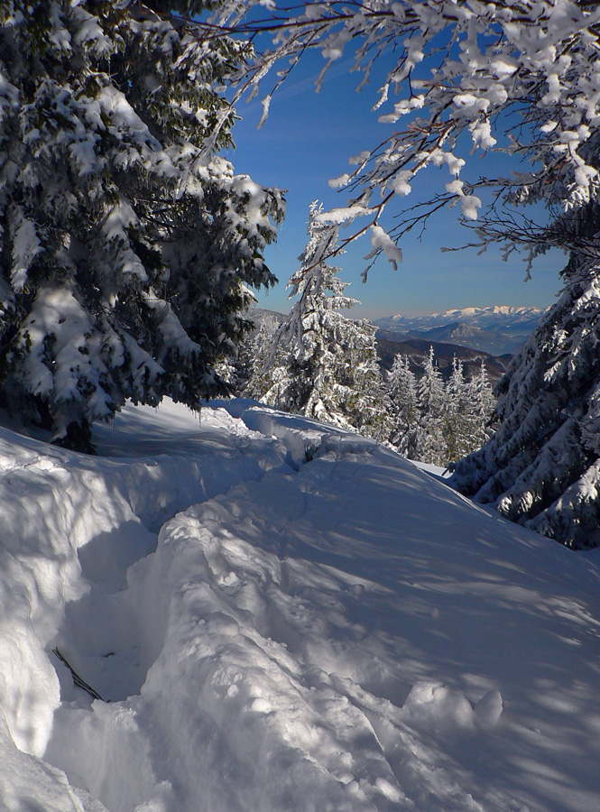 Jednoduchá prechádzka, tak na šesť hodín: z Vrútok hore na Minčol od kempingu po žltej a dole po susednom bočnom hrebeni, po modrej. Bežne nič moc, po zvážniciach, výsekoch a rúbaniskách, len vršok okolo hrebeňa je krajší. Ale v modrobielom počasí paráda. A občas aj prešľapávanie vajcového snehu, aj keď našťastie stopa už bola. Ale tí prví sa museli nadrieť...