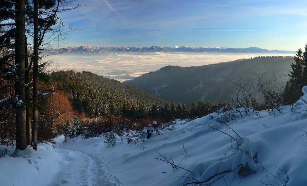 Trochu som ráno špekuloval, či brať lyže, ale nakoniec radšej len pešo... S trochou sebazaprenia by sa dalo stúpať na pásoch už od okraja lesa, od sedla pod Hradišťom úplne komfortne. Dole zlyžovať by to šlo tak do 900m: na žltej po Ráztoky, na modrej pod Diaľnu. Potom ďalej dolu po zvážniciach. Aj cesta na Martinské hole vyzerala byť použiteľná. Ale počkám si, nabudúce...