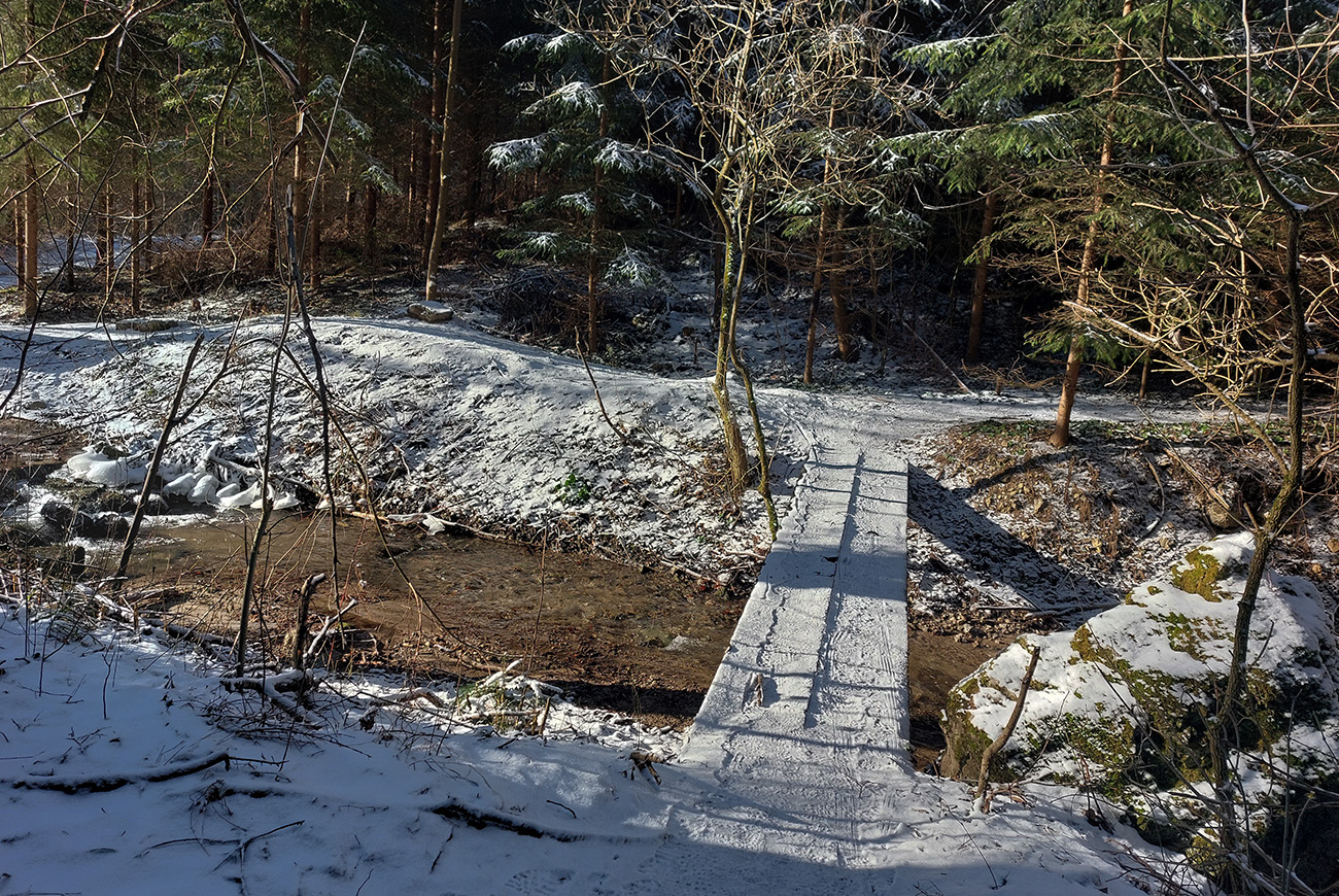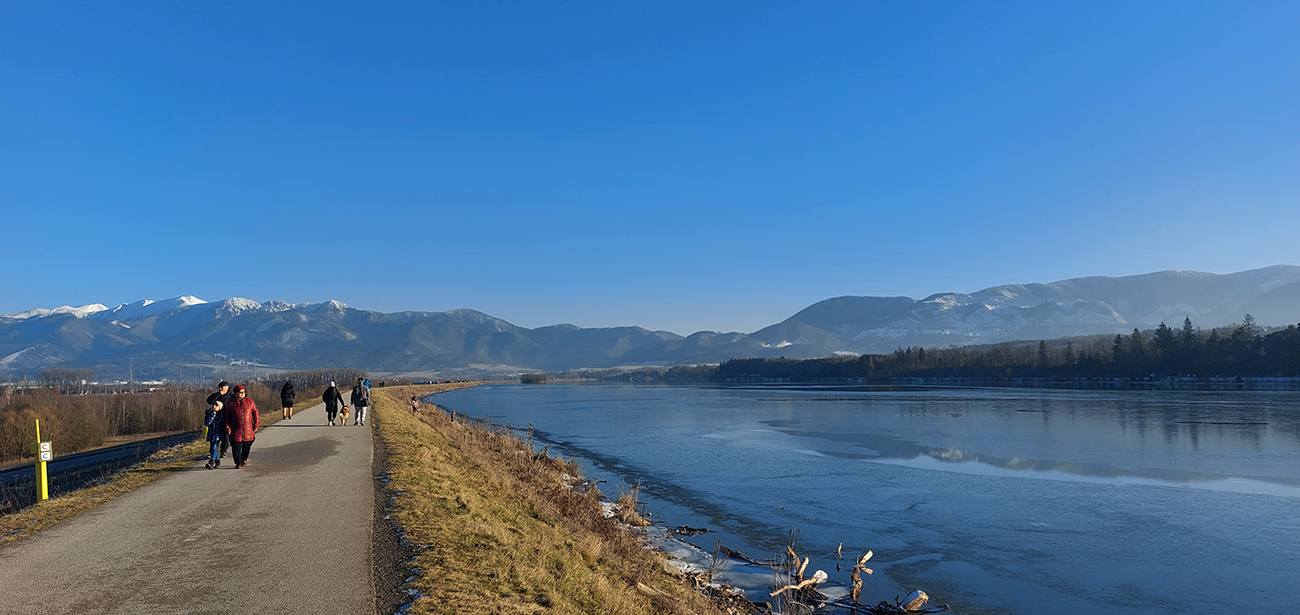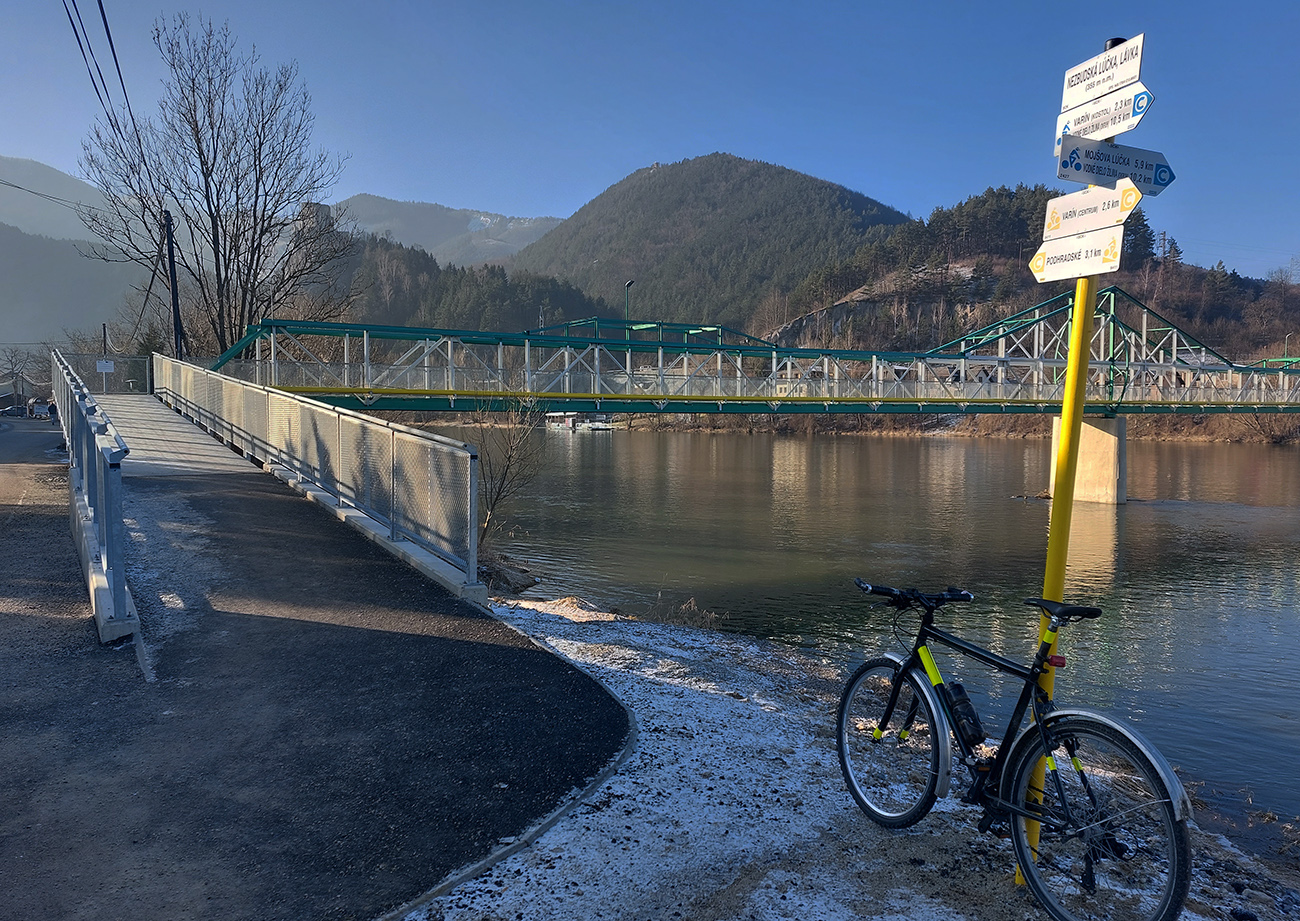 Úvod teda z hlbokého dopoludňajšieho tieňa, od vlaku, po už zrenovovanej lávke cez Váh a neúspešné zahrievanie po rovine po ľavom brehu vodného diela. Moc rýchlo to nešlo, cesta biela, šmykľavá fest, aj vodný ľad sa našiel. To som ešte netušil, ako často sa takéto spestrenia budú opakovať.