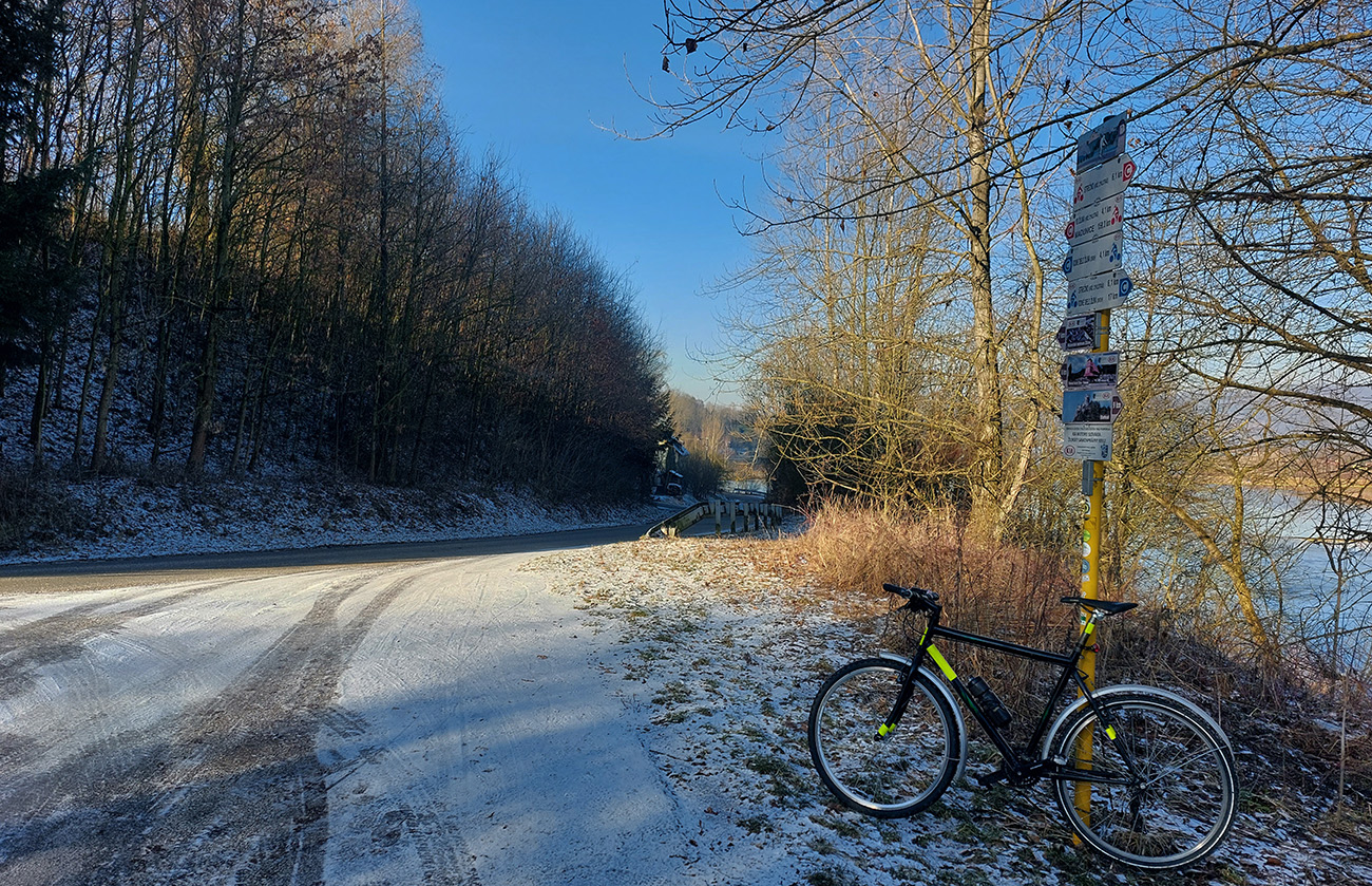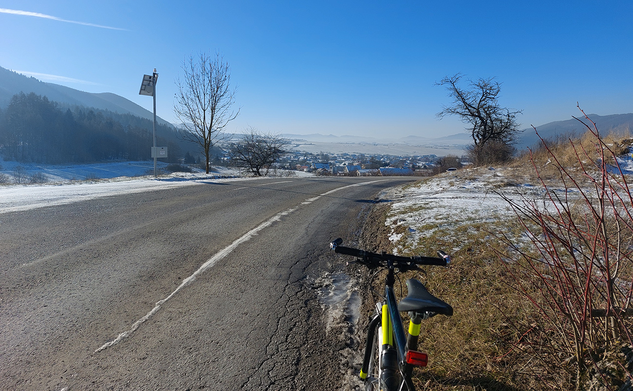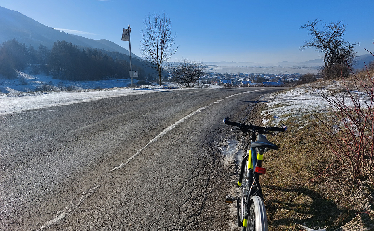 Zamrznutú cyklotrasu som opustil pred Mojšom, preskočil cez hlavnú a začal konečne poriadne zahrievať motory stúpaním cez Stráňavy. Odteraz až po otočku v Lesnej takmer stále proti slnku. Vyliezť som musel až nad dedinu (fajne strmo, bielo a šmykľavo v závere) a pri kríži doprava na šotolinovú spojku popod les do Višňového. Chcel som využiť, že po jasnej noci bude na kosť zmrznutá - jediná výnimka výjazdu mimo asfaltu, aj preto sa zimák s hrubšími gumami hodil. Cestou nazad že potom budem z Višňového už slušne asfaltovať cez Rosinu. No fajná bola tá ranná cyklokrosová vložka, len som sa divil, koľko ľadu je na nej vytečeného. Jeden kopček som aj potlačiť musel, podklzovalo až moc.