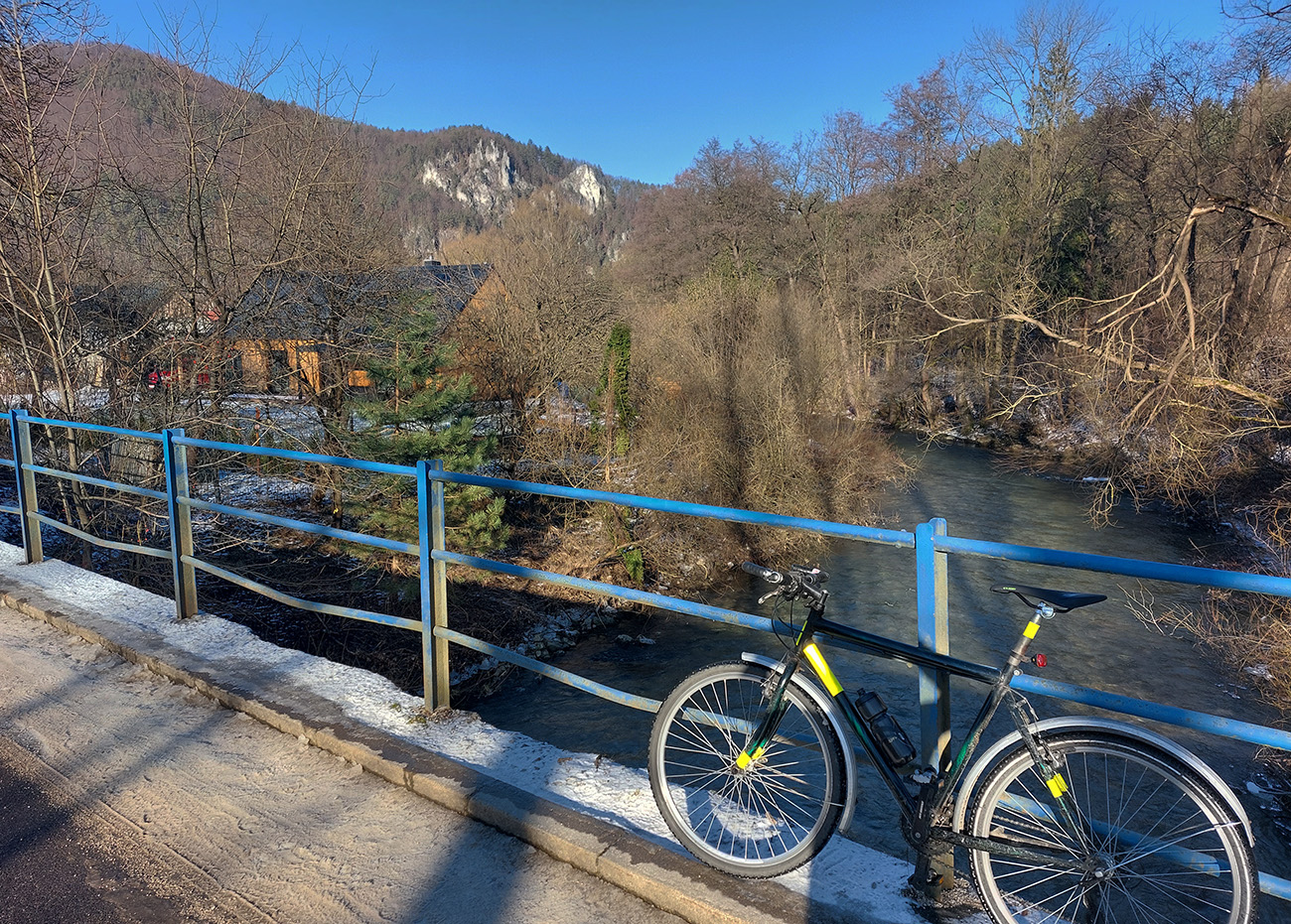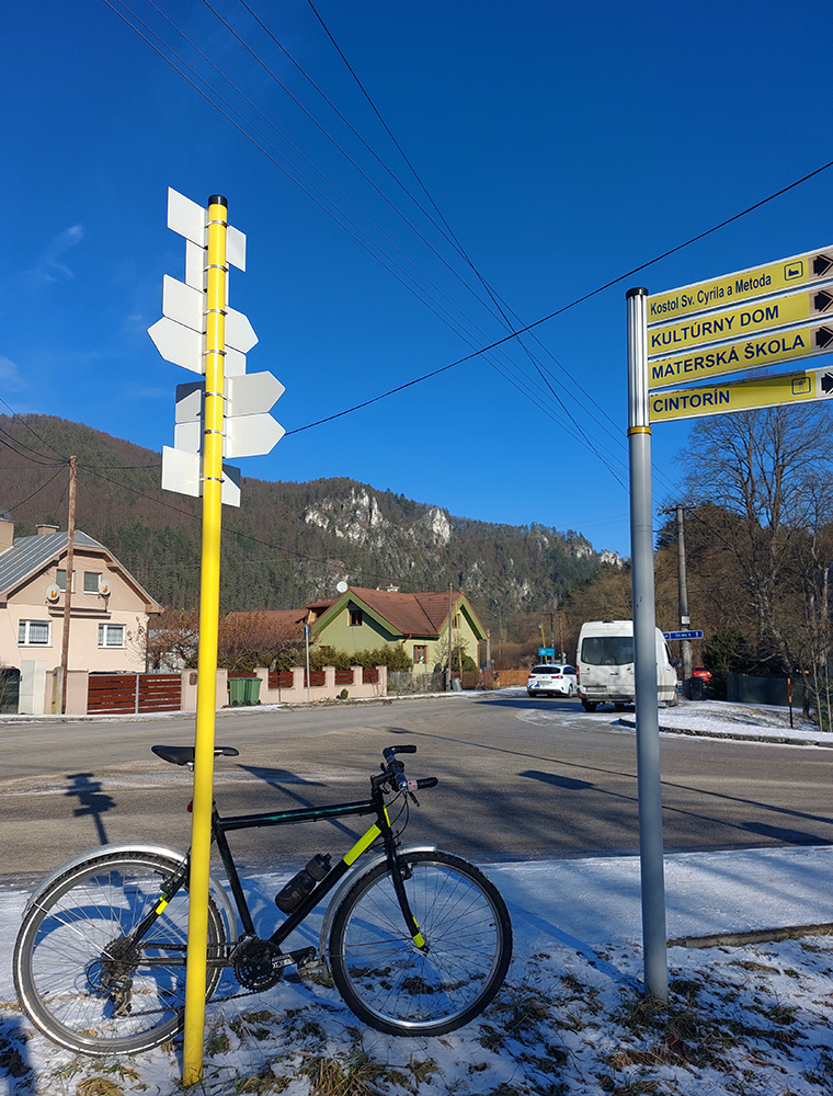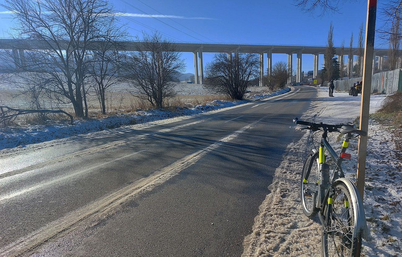 Rýchly zošup cez Turie a popri Turskej skale krátky úsek do Poluvsia po hlavnej. Premávka ozaj hustá, ako vždy, ale zas nie sme z cukru, že? Aj tu by sa to dalo asi obabrať cez lúky, podhorím, po hline a šotoline (teraz skôr po snehu), no netúžil som sa zoznámiť s tým brodom, ktorý je tam na mape nakreslený. Nechám si ho na leto. Slnečné skaly po pravici som cestou radšej moc neobzeral, čumel som pod predné kolo – lebo hlavná síce suchá, ale malé ľadové náteky na krajnici strašili. Odstup 1,5 metra pri predbiehaní tu síce mnohí ešte nepoznajú (najmä tí s ešpézetkami typu „ZA-VODOU“), ale nebál som sa, moje CABRIO svietilo hádam dosť.