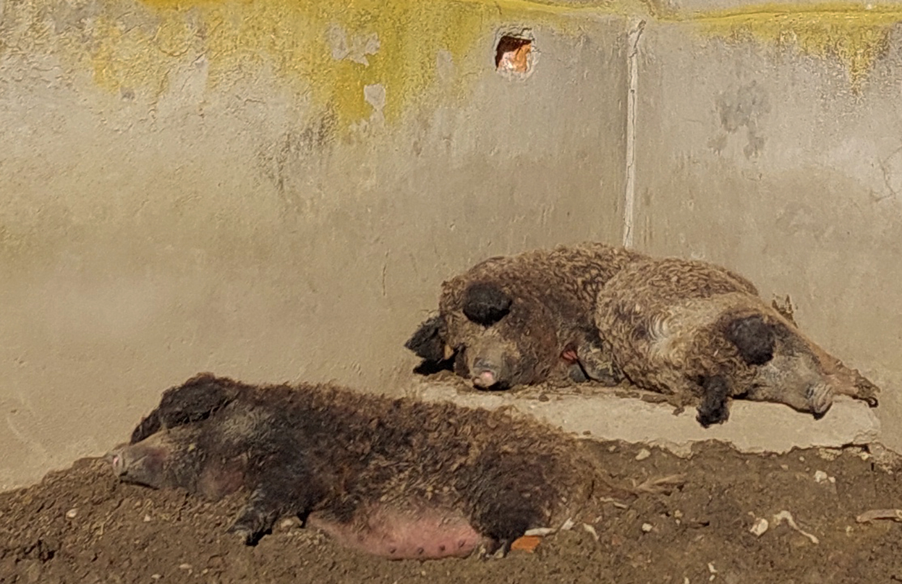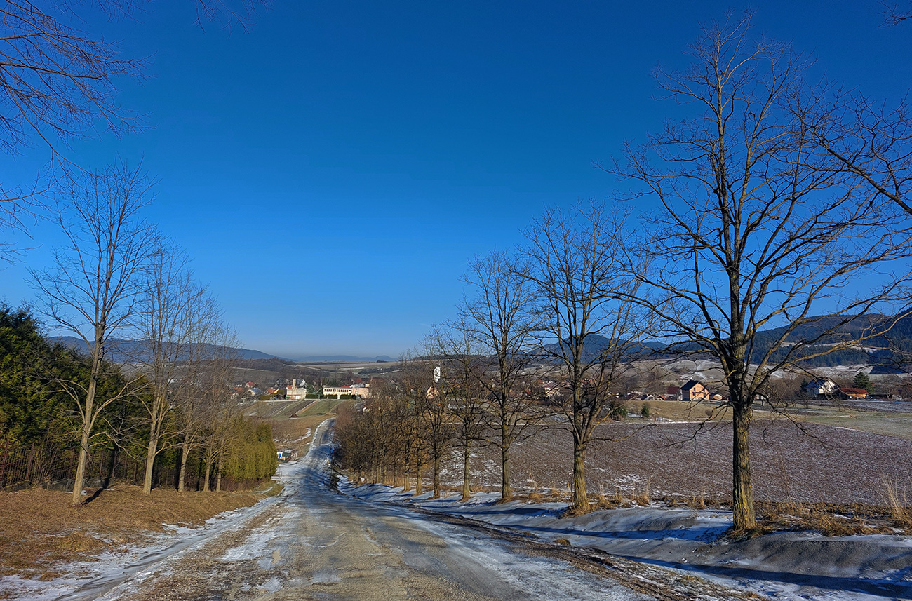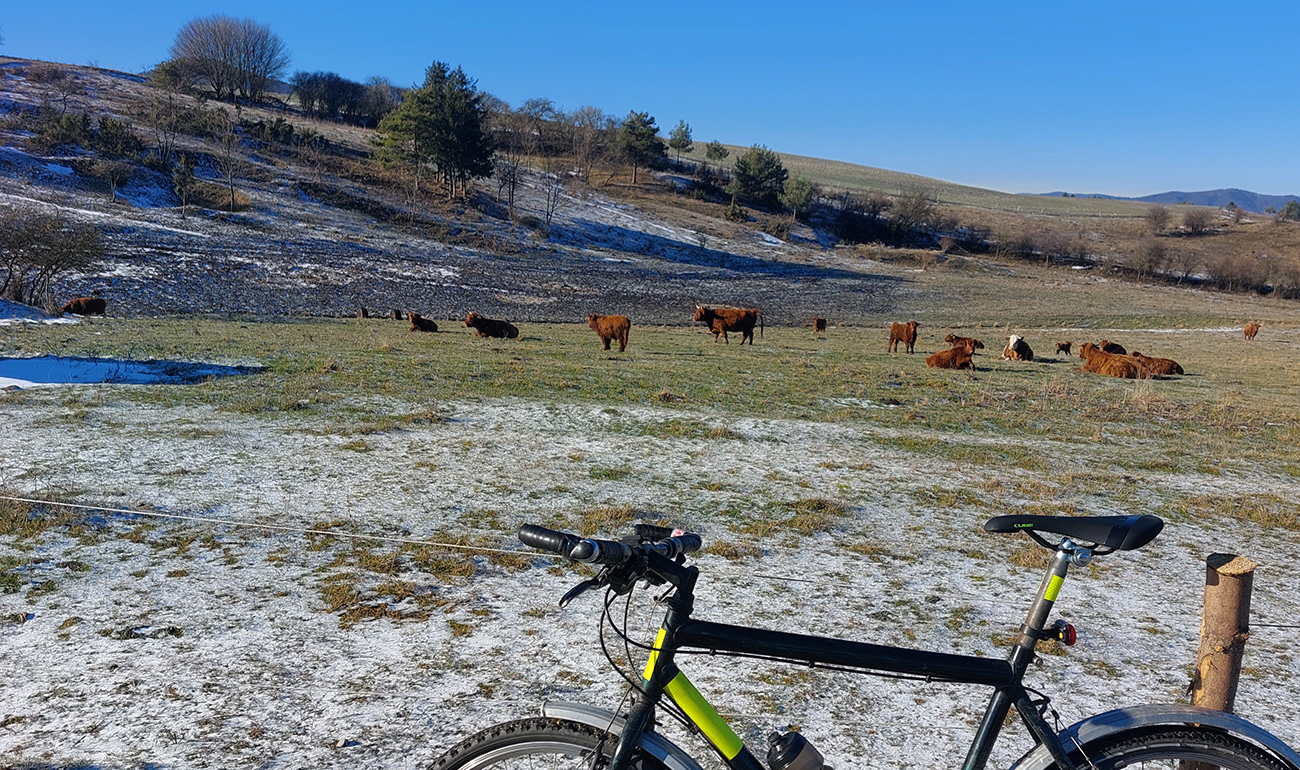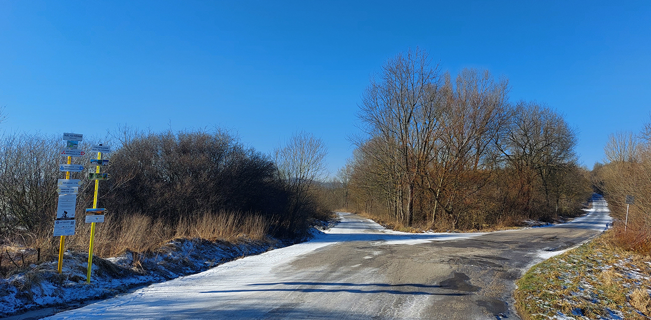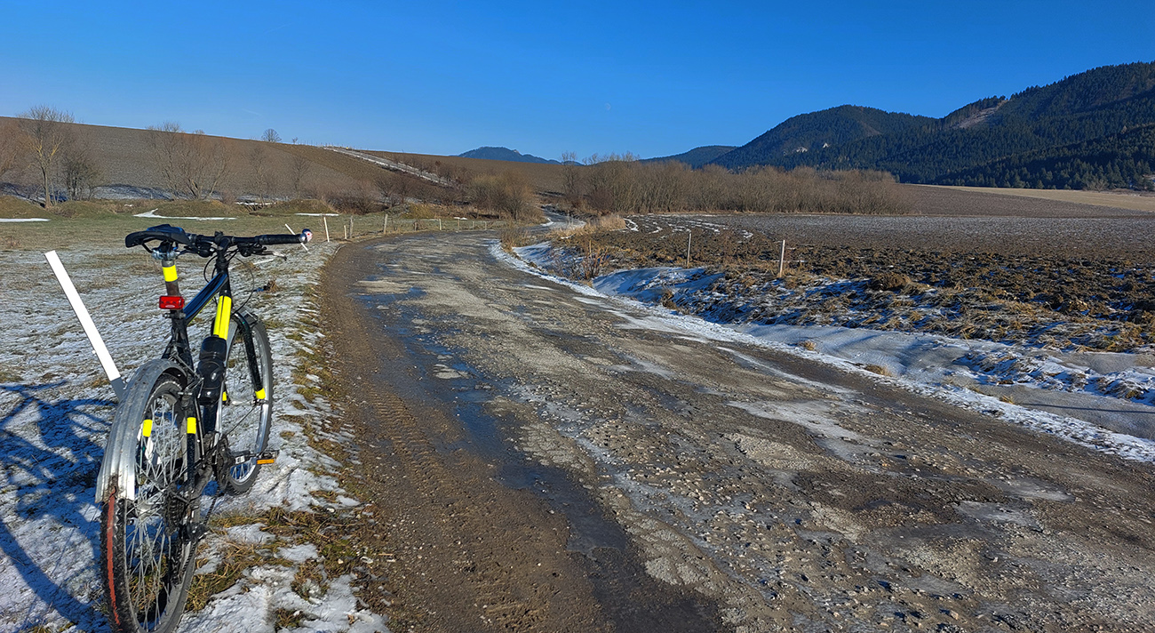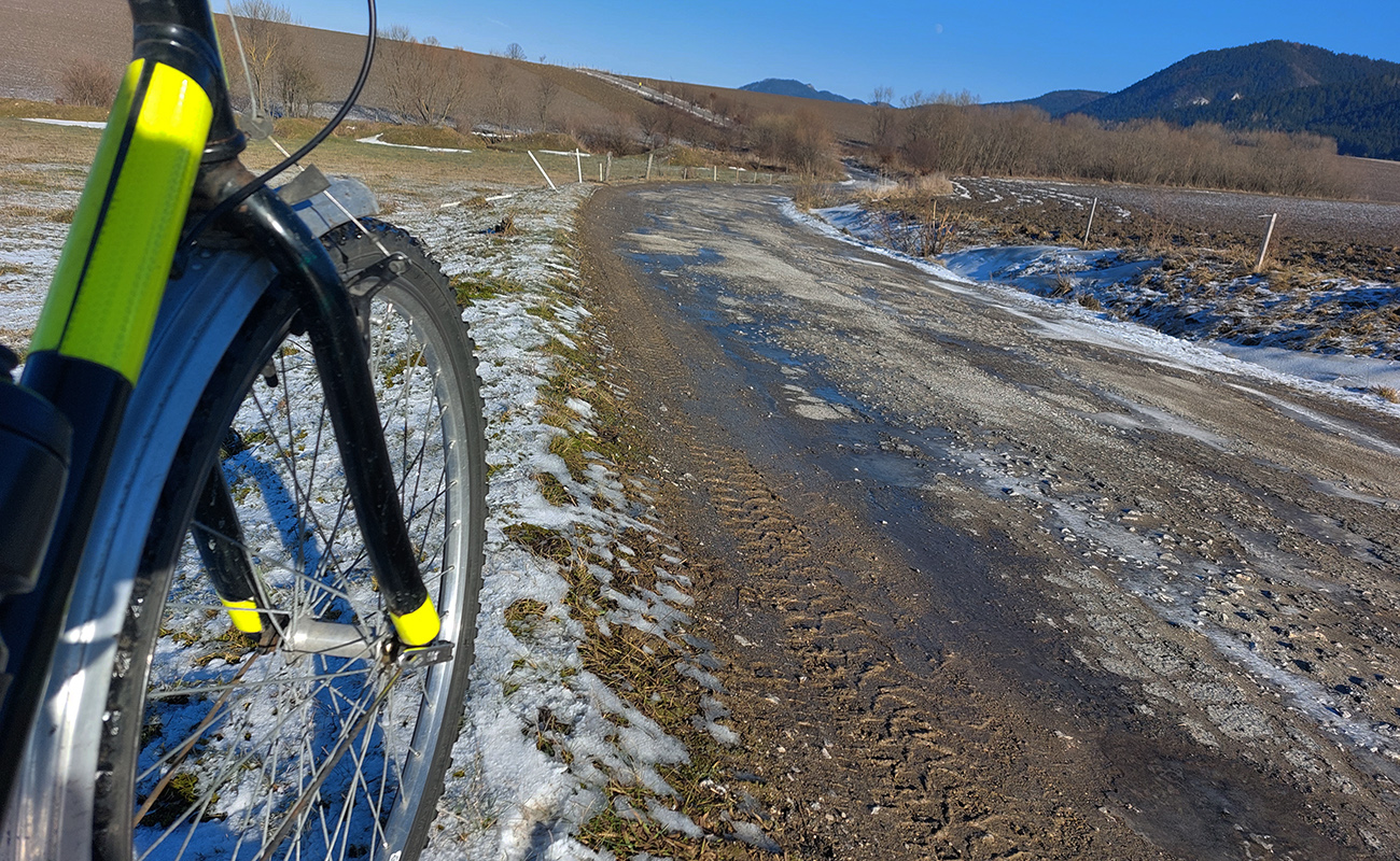 Aj tu všade bolo treba pomaly a opatrne aj v zjazdoch, slizota pod kolami striehla a proti slnku ju niekedy bolo aj slabšie vidieť. Na kopčeku nad Rajcom som minul tú lavičku so srdcom (o nej cestou nazad) a na križovatke pred Rajcom som zadúfal, že nebudem musieť zachádzať cez mesto (inak ďalší nepríjemný, krátky, ale v tieni bielo slizký kopček), ale skrátim si to cez Krivín, cez „družstvo“. Podľa máp sa dá, v realite sa dá tiež – rampa sa dá obísť, brána na dolnom konci otvorená a domáci tadeto normálne chodia na prechádzky do polí, tak som asi netrafil len tak nejakú výnimku. Pozdravil som mangalice, rochniace sa tam v zmrznutom blate, a o chvíľu už som sa plazil smerom na Ďurčinú. Znovu si oči oddýchli od protislnka.