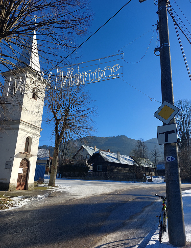V Ďurčinej ma vítala pred kostolom vianočná zdravica, za kostolom výdatne posypaná ľadová križovatka pred školou a neskutočne strmý, a samozrejme neskutočne klzký kopec popri cintoríne. Znovu som aj potlačiť musel. Do Rajeckej Lesnej už potom ďalšia krajinársky pekná spojka cez kopec, len škoda, že normálny žiletkárky podklad sa razom zmenil na brutálne deravú, tisíckrát poplátanú a často len zmesou asfaltu a makadamu zaliatu „družstevnú cezpoľňačku“. No vytriaslo ma kvalitne.