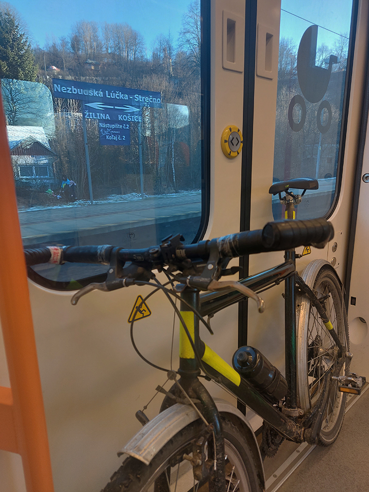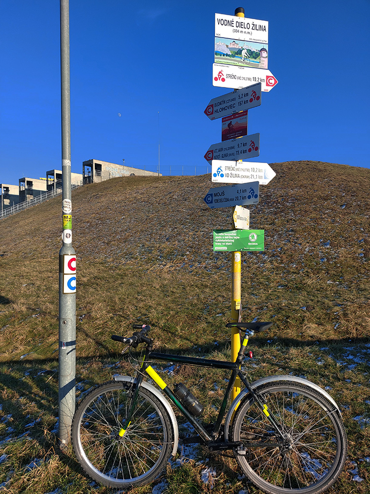 Pre zmenu najdlhší zjazd, až ku hrádzi vodného diela. Tu už fičák bez brzdenia, lebo cesty mokré, isto dobre nasolené, veď som už bočné asfaltky opustil. Zatiaľ pohoda - myslel som si, že mám ku vlaku v Strečne ktovie koľko času. Ale ako už neraz, poriadne som sa prepočítal. To mi doplo, keď som porovnal zostávajúci čas a kilometre na smerovníku pod hrádzou. Lebo predtým mi nedoplo, že som oproti štartu zašiel teraz o dosť ďalej k Žiline. Vlastne až do Žiliny. Tak ak som nechcel hodinu do ďalšieho vlaku a do tmy tráviť mrznutím na peróne alebo poletovaním po chladnúcej krajine (tiene rýchlo rástli), nasledovalo zaľahnutie do neexistujúcich časovkárskych nástavcov a kľučkovanie v plnej rýchlosti pomedzi kozrujúce sa davy na hrádzi. Dobrý časovkársky tréning to bol! Stihol som našťastie v pohode, aj s vyjazdením – vlak prišiel asi o dve minúty. Tomu sa hovorí načasovanie!