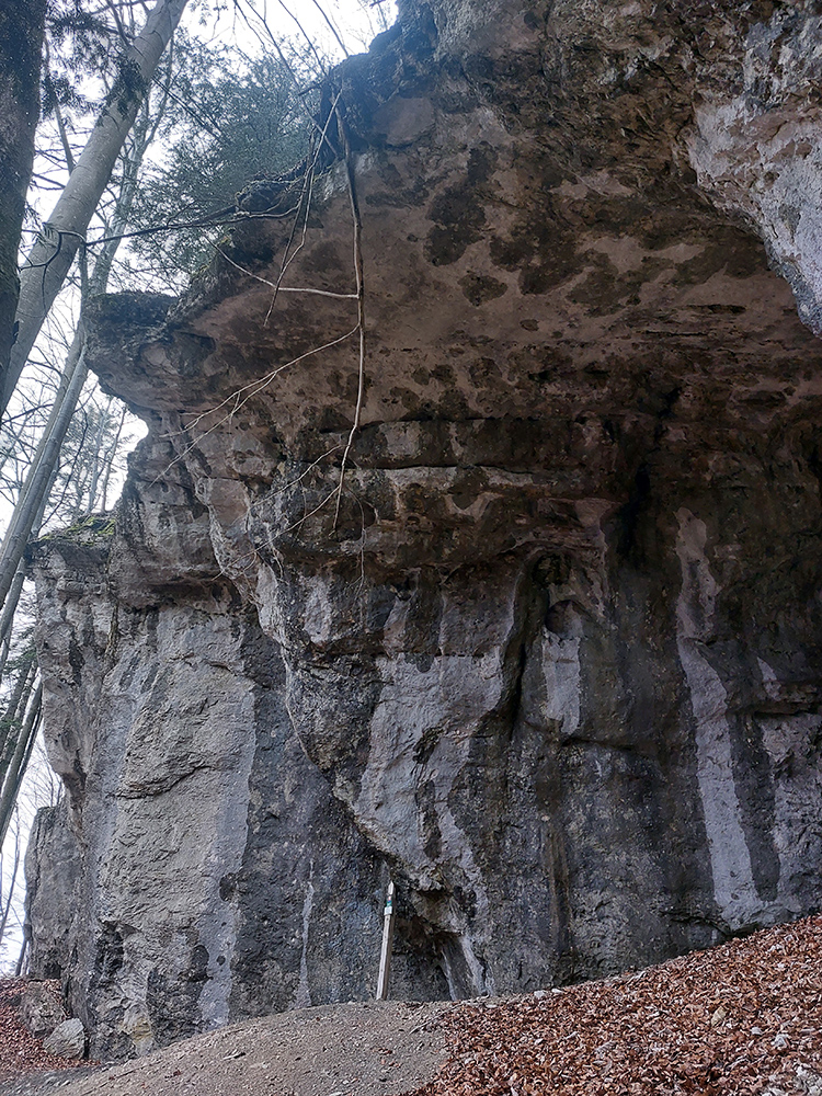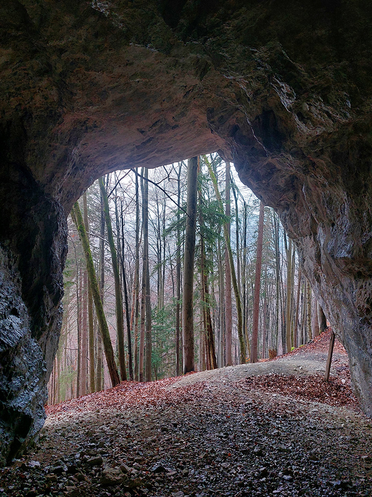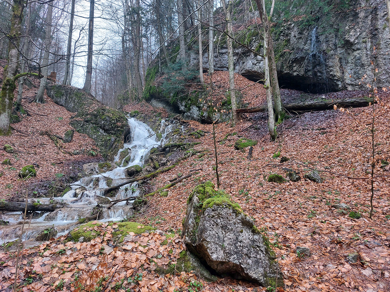 Dolina Túfna je najkrajšia na spodku. Najhrboľatejšia. Potom sa chodník dostane vyššie nad potok, potok zmizne a keď nastane zákruta doprava, treba sa obzerať po nezreteľnej odbočke k jaskyni. Vedie od bralka pri chodníku priamo popod steny k portálu jaskyne. Oplatí sa tam pomotať, aj dnu zájsť: