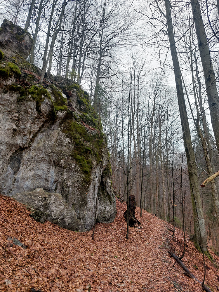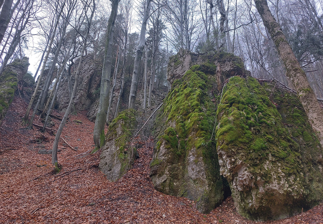 A tak aj je – od konca cesty pokračuje zreteľný poľovnícky chodníček, pomedzi pekné skalky. Síce sa po chvíli stratí v spleti jeleních prtí, ale neva. O chvíľu už vidím naproti na Čremošnianskych lazoch „Kráľov dvor“ a k nemu viem, ako sa z doliny dostanem. Takže z jednej vyhliadkovej skalky valím priamo dole, po hrebienku, po hranici porastov, pohodlne, aj keď strmo. Zostup mi spríjemňujú kvitnúce lykovce.