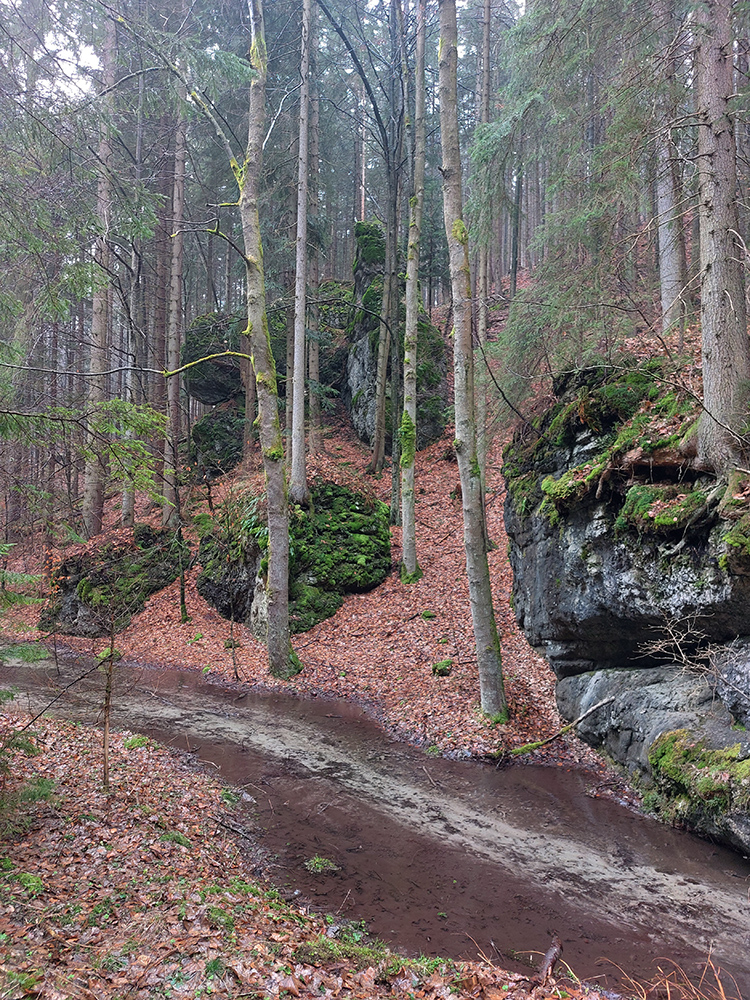 Žltá značka do doliny Suchý Rakytov nie je rýchly zbeh, lebo hore strmá hlina, nižšie hrboľatosť poriadna. Dokonca pár malých kaňonov, chvíľu dokonca potok po chodníku tečie. Dolu v doline veľa asfaltu, ale aj ďalšie krásne kaňony, taká malá Manínska tiesňava.