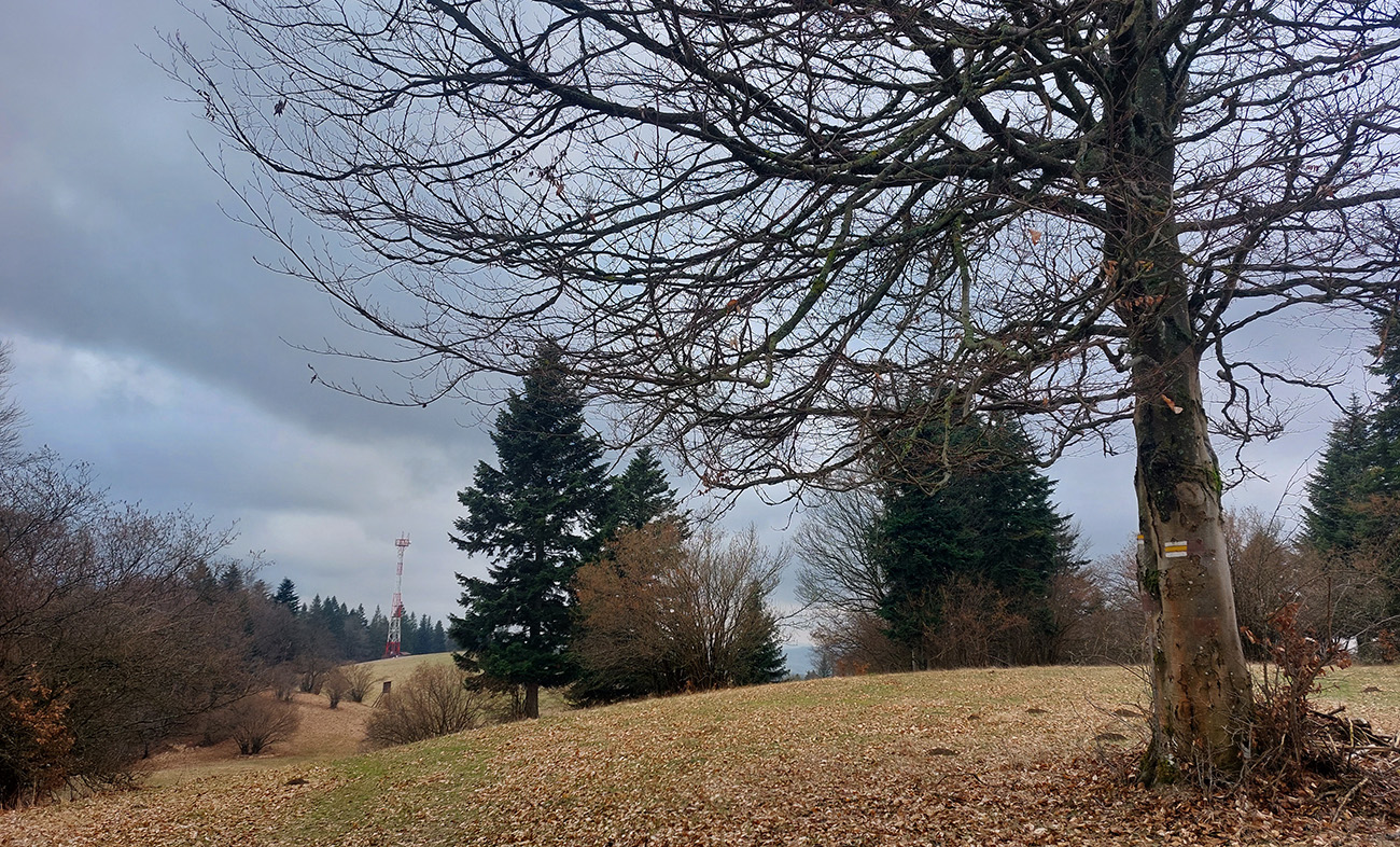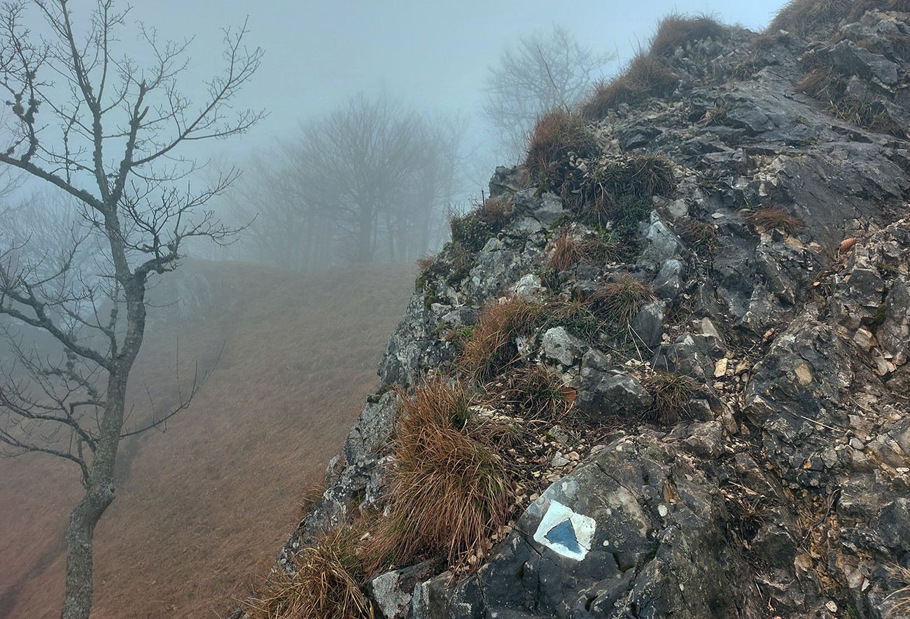 Už z diaľky vidím, že na Drienku sedí mrak (nižšie sú mraky tiež, som v nejakej medzivrstve), no ešte nie som rozhodnutý, kade dole, tak idem hore. Prestalo konečne mrholiť, ale chodník aj tak suchý (aj predtým), veď ako na vápencoch bralnej Fatry. Hore len fotím to pravé, plnotučné mlieko a davaj nazad. Neznačený poľovnícky chodník si odpustím, lebo keď si pomyslím, do akého lesohospodárskeho mordoru dole ústi...