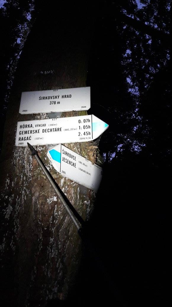 Presunom cez Jesenské budíme miestne psi, postupne s nami sa prebúdzajú ďalšie a robia zvukovú mexickú vlnu. Pohodovým tempom po asfaltke prídeme do Širkoviec, pomaly svitá. Iba jeden z nás má zapnutú čelovku. Značka miery za cintorín a zrazu na akýsi dvor, zrejme bývalého družstva. Psi brešú ako divé, ale sú priviazané. Z domu vychádza chlap, zrejme ešte podgurážený z večera, priamo na nás s obligatórnym: „Kam ideš?“ Rozmýšľam, že povedať, že do Lučenca, bude asi blbé. Tak vravím, že na hrad. „Tadeto?“ „Je tu značka.“ „Tu nič nie je.“ „Choď preč, tam medzi oplotky.“ Tak sa vraciame ideme medzi oplotky, aj keď značka viedla inokade. Prídeme pod Širkovský hrad, hľadáme nejakú cestu, chodník, nič, tak priamo hore strminou, len tak, snáď sa tam nejak pripojíme.Chodník nachádzame, po sto metroch značku znova strácame, sem-tam chrapaština, šipky pri zmene smeru chýbajú, alebo ich nevidíme. Turisticky stratená trasa. Viem, ako je to aj so značkármi v tomto regióne, že nemá, kto robiť a tak. Až po Sedlo pod Deravým cerom je to dosť intuitívne. Smejeme sa, že takto maskovať značky muselo dať veľa práce.