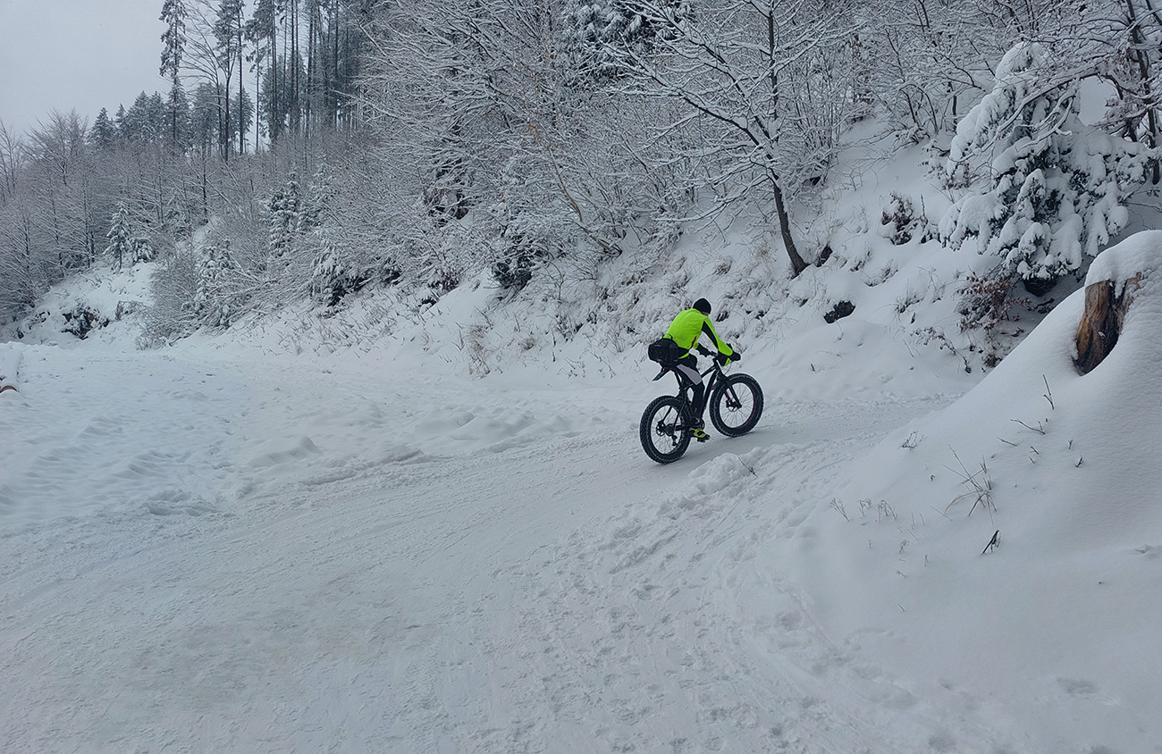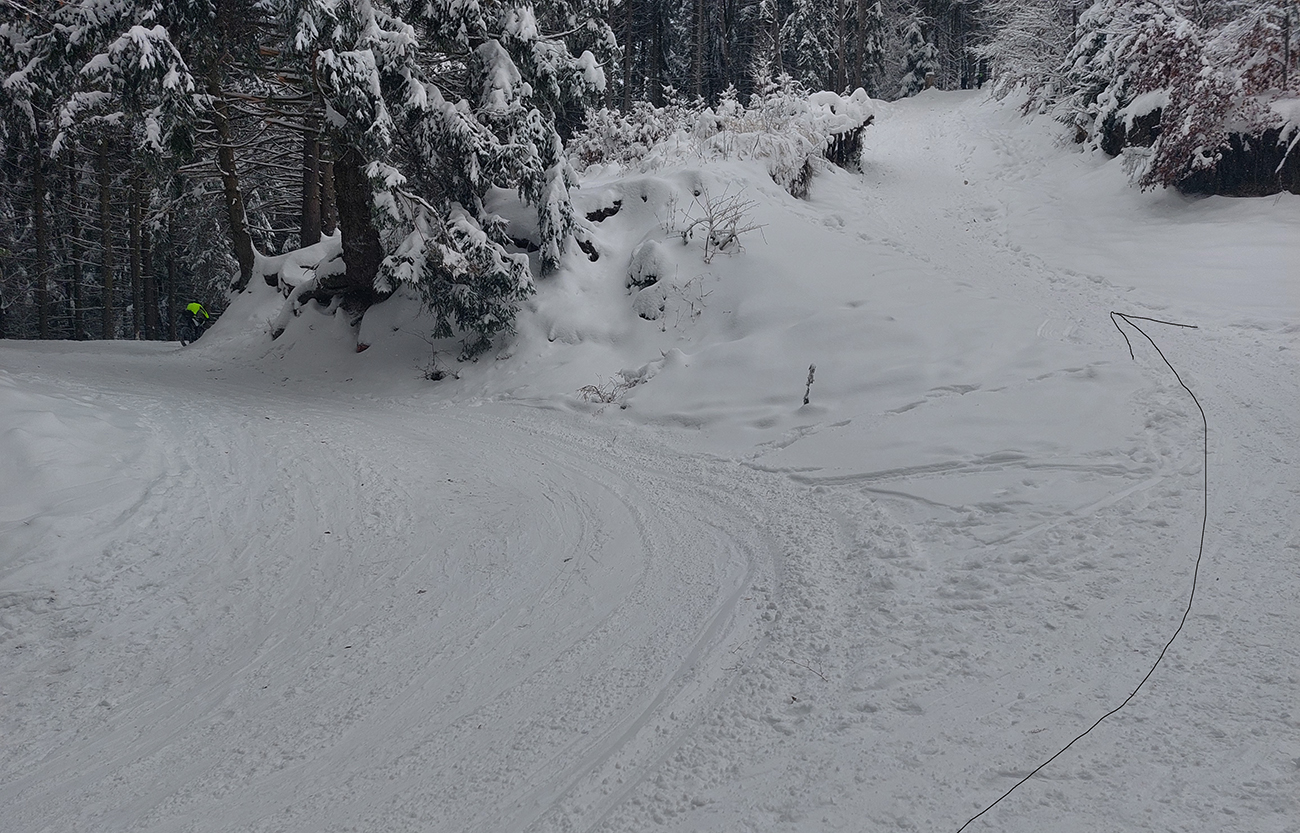 Piatkové oteplenie a sobotňajší krátky dáždik podkladu vôbec neuškodili, skôr pomohli, lebo sa rýchlo ochladilo a už v sobotu okolo obeda na to padal čerstvý sneh. Takže v nedeľu krásne bielo, žraloky schované v hlbinách. Aj keď na skratke nad delom jeden taký prerastený vystrkuje nos furt. A potom aj vyššie nejaké malé pirane, na posledných skratkách – ešte toho snehu nie je priveľa, ale zas čo by sme chceli, že?