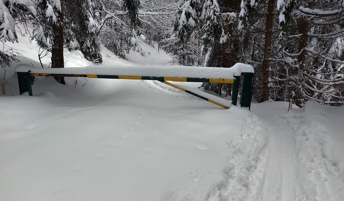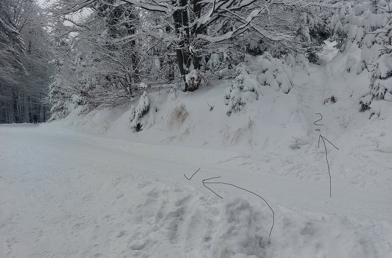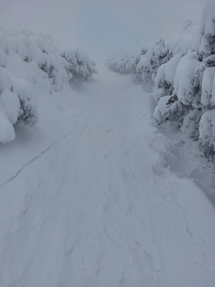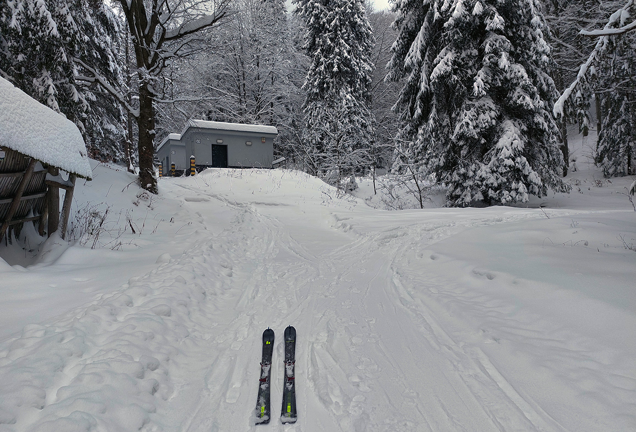 Vleky ešte neťahajú, tak cesta krásne biela tiež – a neposypaná! Odbočka ku Čučoriedke prehrnutá skoro až na podklad, ale myslel ten pluh na šliapačov, bezpečná je. Široká, tvrdá. Aj oblúk sa dá vykrojiť cestou dole. Podobne zjazdovka, príjemne lyžovateľná. Šliapateľná najlepšie po pravej strane (pri pohľade zdola), lebo vľavo syčia delá.