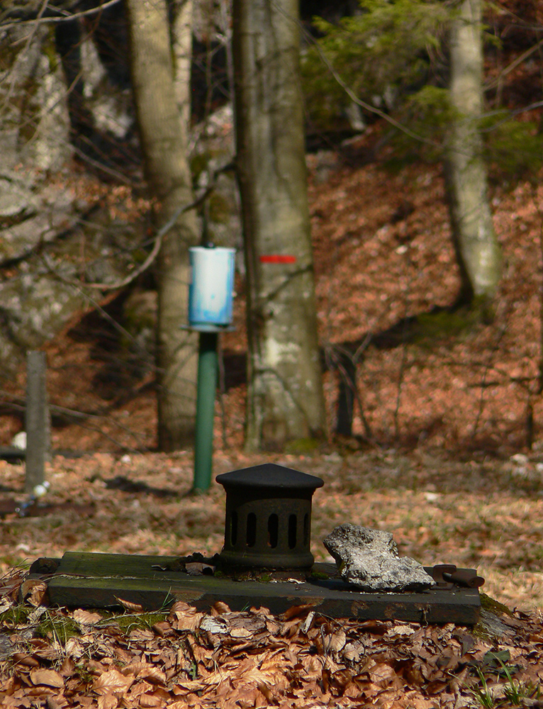 Pár serpentín, z jednej je krátka odbočka doprava k novej chatke v oplotenom areáli. Podľa insitnej (alebo infantilnej?) umeleckej výzdoby asi tiež jágri. Chatka je ale pre orientáciu dôležitá. Priamo nad ňou, za poslednou serpentínou, asfaltka totiž pokračuje už priamo na severozápad popod hrebeň, lenže treba ísť doľava, po výraznej, spevnenej lesnej ceste, ktorá asi po 500 m (za prvou zákrutou) križuje modrú značku.