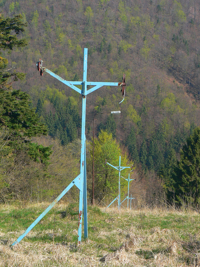 Po miernom stúpaní nasleduje kúsok lúk (nad čremošnianskym salašom) a zostup na asfaltku do Čremošného. Zelená značka tu kedysi viedla okrajom lesa, ale odkedy sú pasienky ohradené... Nevadí, do dediny je to len kúsok a pri zastávke značka mieri nazad hore pod les. Na lúky Čremošnianskych lazov by sa dalo aj po modrej, ale tá ide celou dedinou po ceste, len hore trochu po lúke, zelená je na lúky bohatšia. Ale aj tú treba v Čremošnianskom sedle opustiť a krížom cez lúky (cesta zablúdiť nedovolí) sa dostať k smerovníku, kde modrá končí a žltá z Teplíc pokračuje našim smerom. Tu sú výhľady na všetky strany: spoza obzoru vpredu vykúka Drieňok, vzadu vysielač na Skalke, v opare ďaleko na juhu sa črtá Vtáčnik, naľavo sa rozprestiera kotlina a cesta vedie ďalej po žltej popri troch vlekoch, ktoré to už majú dáááávno za sebou.