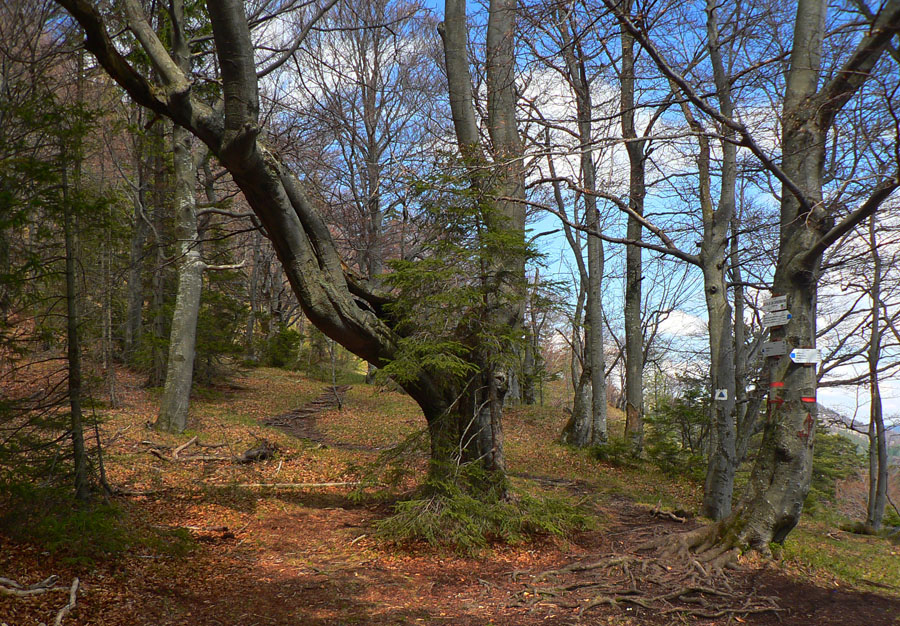 Chodník v lístí moc nevidieť, zato je čoraz strmší a najstrmší je na konci, pod hrebeňom. Hrdzavý smerovník, nepovie nič, tak valím ďalej príjemným traverzom do sedla pod Drienkom. Bukový les, sem-tam výhľady. Zo sedla na Drieňok je to vraj hodina, reálne tak 40 minút aj s vydýchaním, lebo strmé je to fest. Zato pekným, akoby parkovým lesom. Z predvrcholu je pekný pohľad dolu do doliny Rakše, ktorou sem hore ide ďalšia modrá značka.