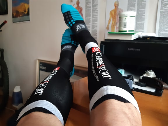 Dôležité sa ukázalo okrem perfektne naplánovaného jedálničku aj ďalšie rozhodnutie: Dni pred štartom ma trápili lýtka, nevedel som si predstaviť ako by to mohli vydržať. Opäť so šťastím som sa deň pred štartom dostal ku kompresným návlekom a ponožkám Compressport od Adamsport.eu . Niečo podobné som už úspešne testoval pri behu ale nikdy som s tým nebicykloval. Zaúčinkovali perfektne. Hovorí sa, že nevyskúšané veci sa nemajú na takéto akcie nosiť ale ja som nemal čo stratiť, mohol som iba získať...