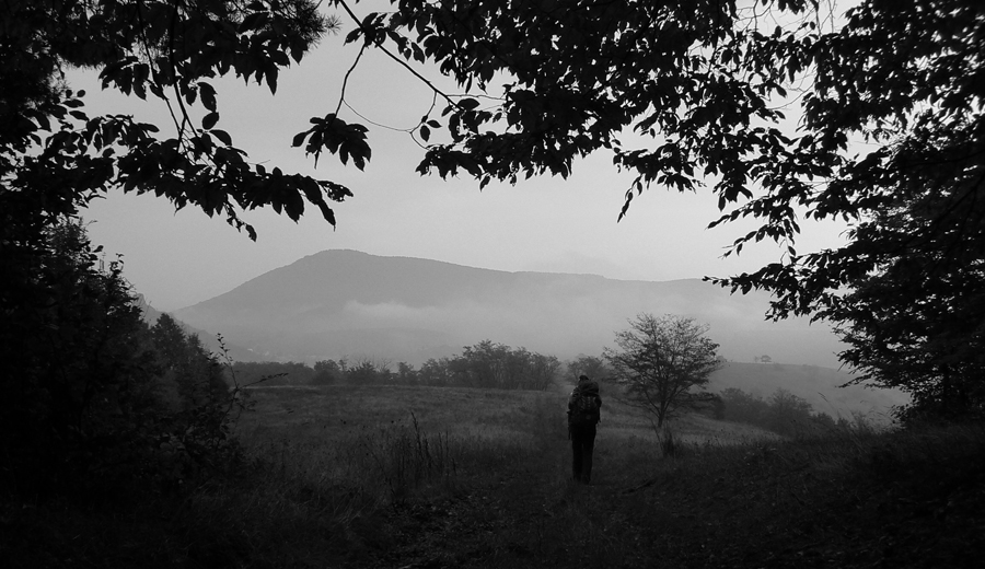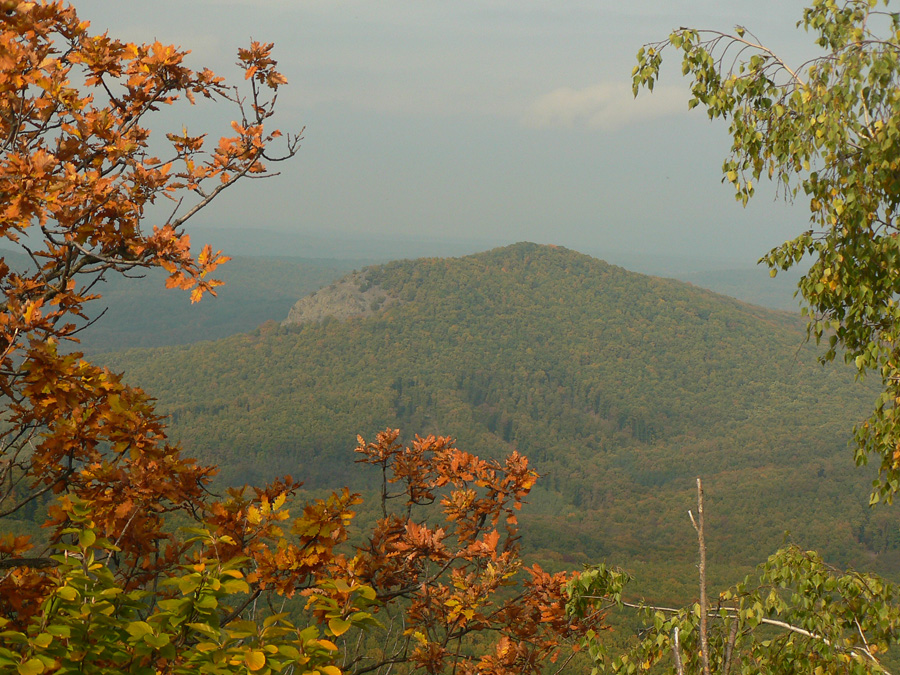 Potom už husací pochod dole zo „stolovej hory“. Les je bez slnka zatiaľ trochu všedný, ale to sa isto spraví. Našťastie nad stromy trčí plešatý Tilič (475m) s majestátnym výhľadom od juhu cez východ k severu. Presne tam, kam máme namierené. Najbližšie je Hajnáčka. Zas skúšame, čo sme schopní odfotiť pomedzi hmly a mraky, konkurujeme miestnemu fotoamatérovi, ktorý si musel ráno isto dobre privstať, aby sem dotiahol svoju strojovňu až z Fiľakova, na bajku. A vrtí sa po kopci hore-dolu, usilujem sa odkukať aspoň to, kam mieri objektívom.
