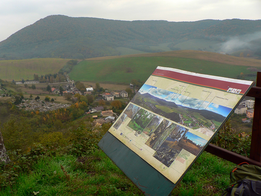 A zas hľadáme značku, lietame zo zvážnice na zvážnicu a nikde nič. Rezerva sa stenčuje, aj keď ešte stále žije. Nakoniec dáko intuitívne tú Steblovú skalu (486m) triafame. Keď už zas lezieme takmer po štyroch, vieme, že ideme správne. Hlava hore: nádherné čadičové stĺpy stoja v rade ako píšťaly organu. Nad nimi na plošinke smerovník a výhľad do doliny Gortvy, kade sa (dúfam) budeme o dve hoďky viezť vlakom.