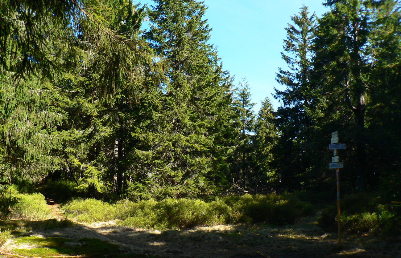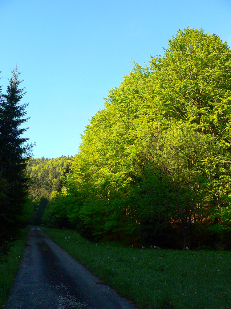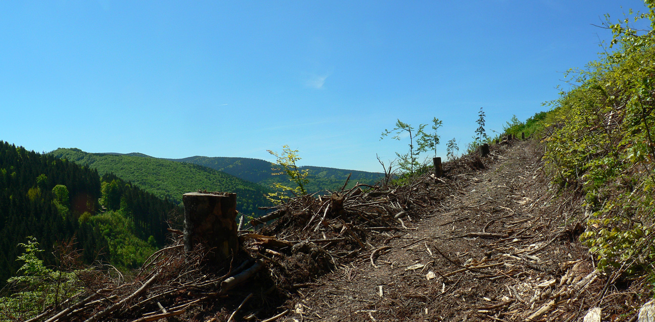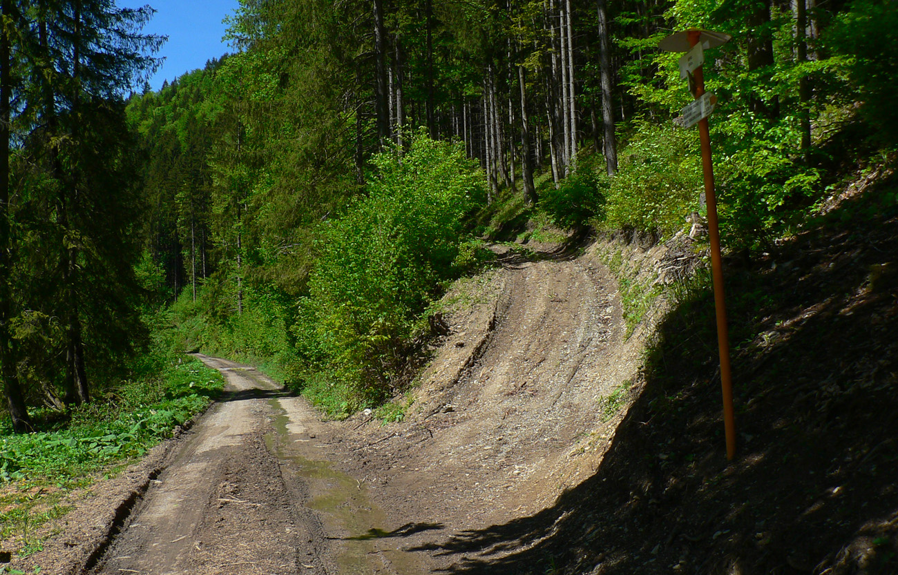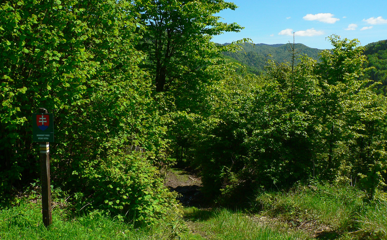 Na začiatok som sa teda potreboval dostať do ústia Čiernej doliny. Z Teplíc tam síce vedie zelená, ale tú poznám, tak som išiel preskúmať alternatívu – Multifunkčnú Greenway Trasu. Podľa názvu to musí byť bomba a nad ústím sa napojím na tú zelenú, som si hovoril... Hej, bomba zvážnica je to, navyše po dažďoch májových, mňam. Ak bolo sucho, tak vďaka makadamu. Výhľady asi dva, cez čerstvé rúbane. Ale účel splnený, pri chatách som sa napojil na zelenú, spadol spolu s ňou na hlavnú cestu a oproti už svietil smerovník v ústí Čiernej doliny.