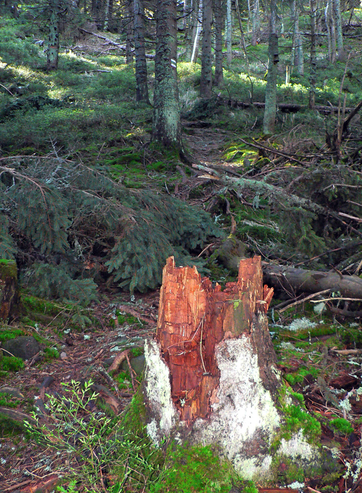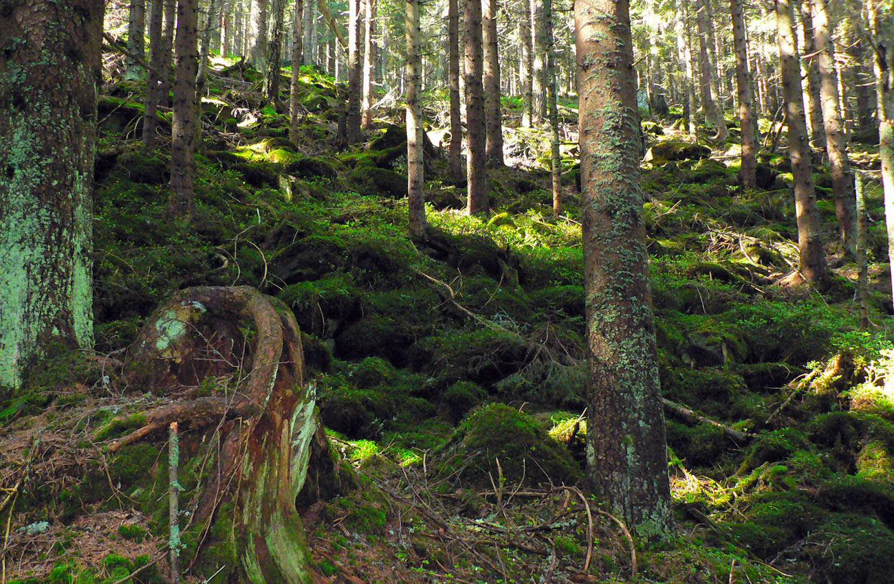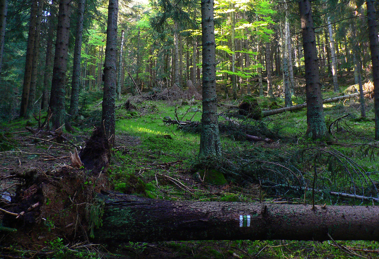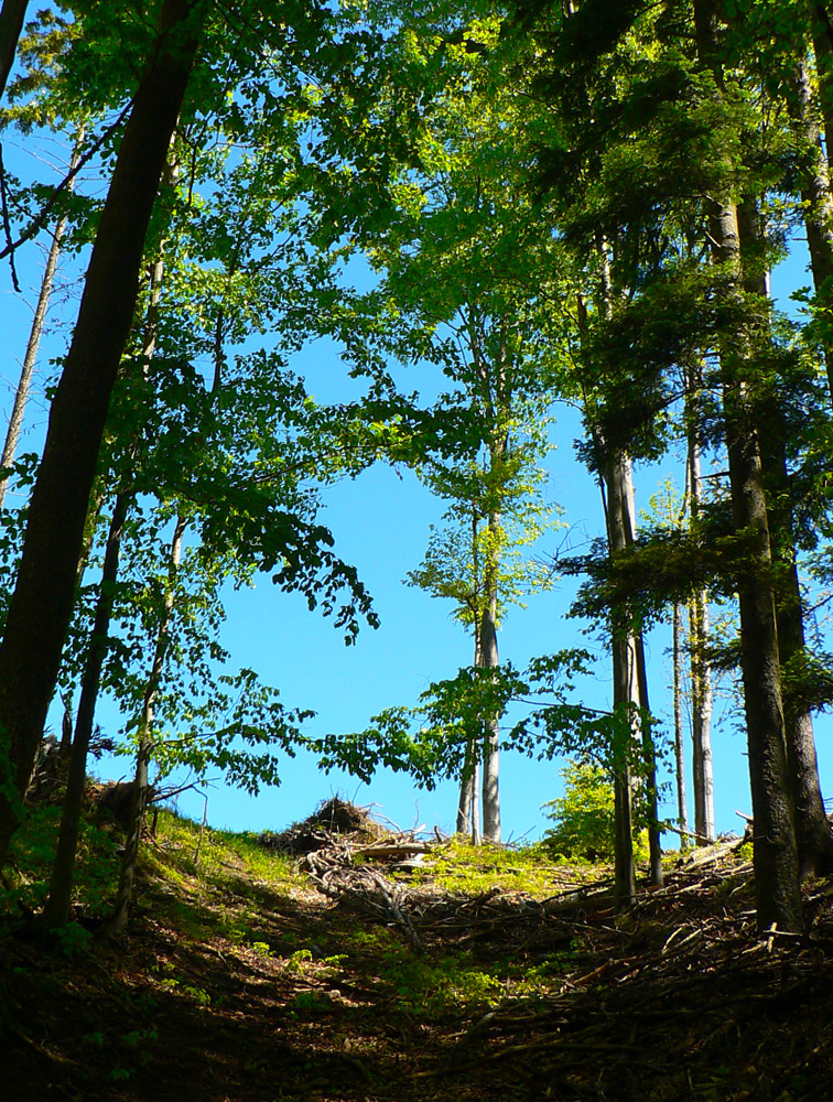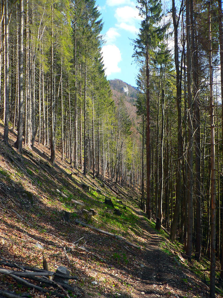 Lebo odtiaľ už len poriadne strmá zvážnica. Pozvoľne sa mení na chodník a naberá stále viac percent. Les okolo zdivočieva, navyše ostatná zima vďaka návalom snehu a následnému odmäku s víchrom tu pováľala preveľa stromov. Keď už potok spod kameňov obalených machom nevidno, len počuť, sklon a divokosť dosahujú svoje maximá, už to dlho netrvá a sme hore.
