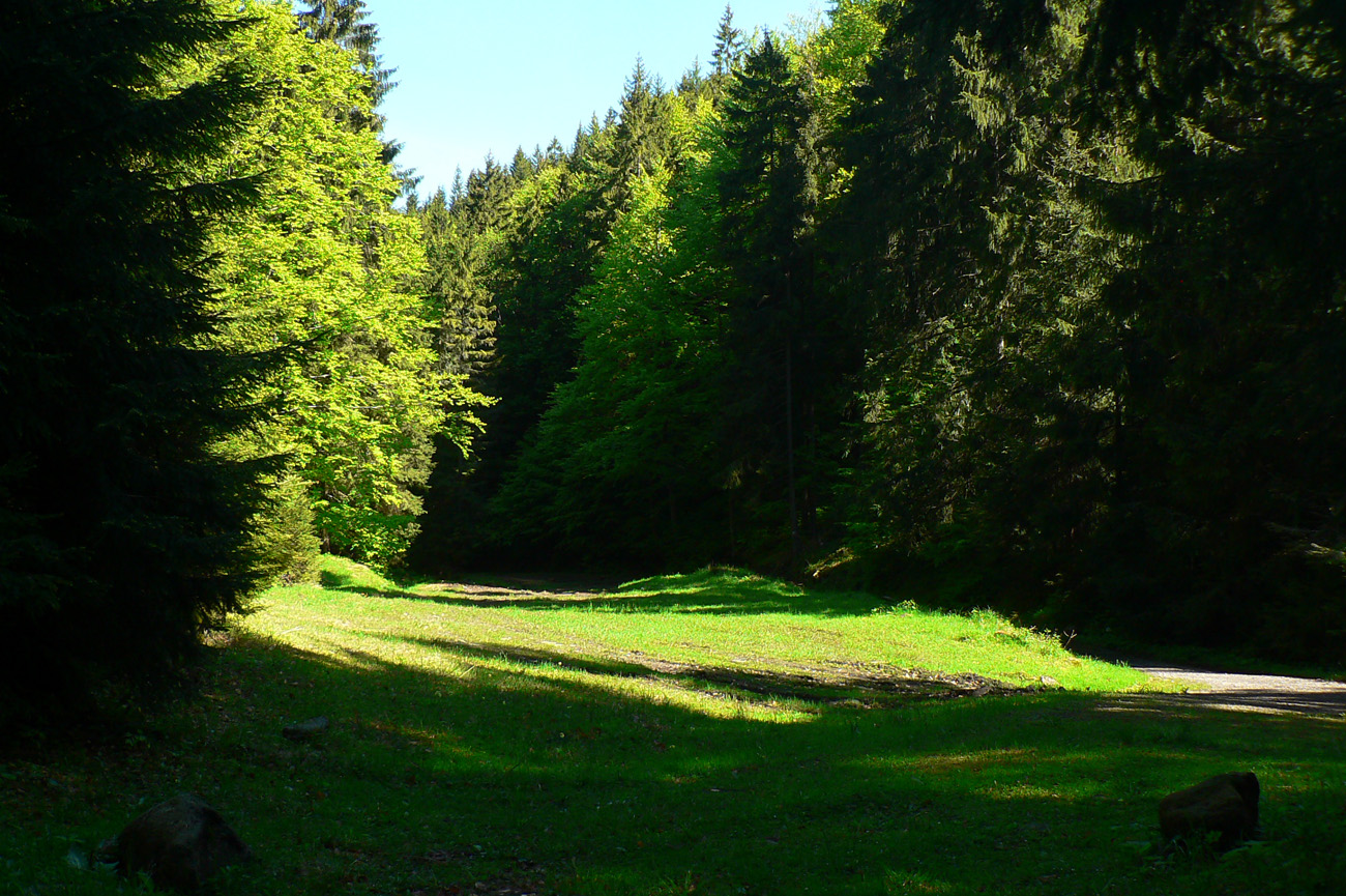 Čierna dolina je taká príjemná, kultivovaná: na úvod železničný viadukt vysoko nad hlavou, potôčik šumí , cesta spevnená, aktuálne sa tu moc neťaží. Krmelce, lúčky. Sklon mierne rastie. Pri smerovníku Ležisko veľký drevosklad, hop cez potok a koniec srandy.