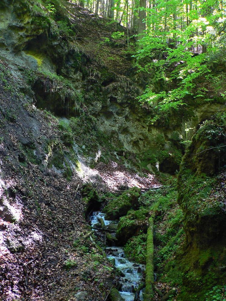 Mäkká lesná cesta sa mení na asfaltku, ale nenudí. Aj tu je dolina pekná a je tu ešte jedno prepadlisko. Dramatickejšie ako horné, lebo nevyplnené vodou. Potok malým kaňonom vteká do jaskyne vo svahu. Kto chce vedieť, kam tá voda ide, musí až k východnému portálu čremošnianskeho tunela. Ľuďom od BB po ZH tečie aj doma z vodovodu.