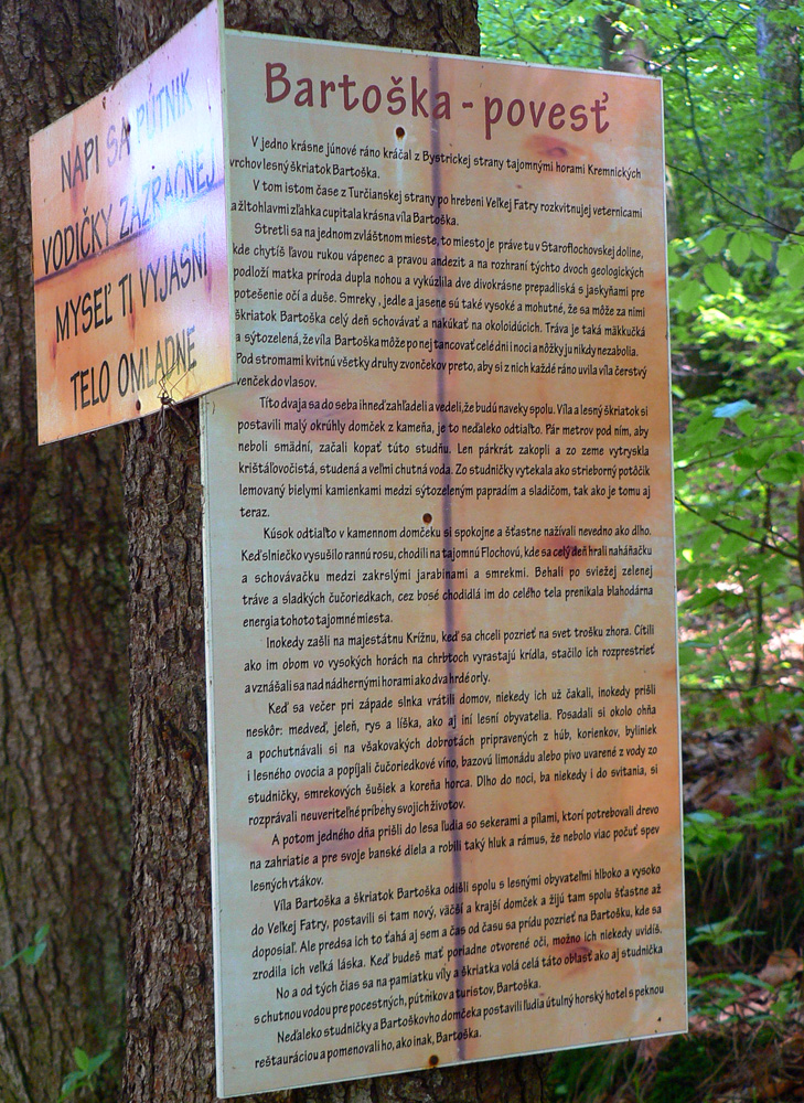 Po vynadívaní sa na prepadlisko už len kamenný domček víly a lesného škriatka, prameň dobrej vody pri ceste aj s lavičkou a písanou legendou o tých dvoch, horský hotel Bartoška a znovu hlavná cesta. Vrelo odporúčam túto prechádzku.