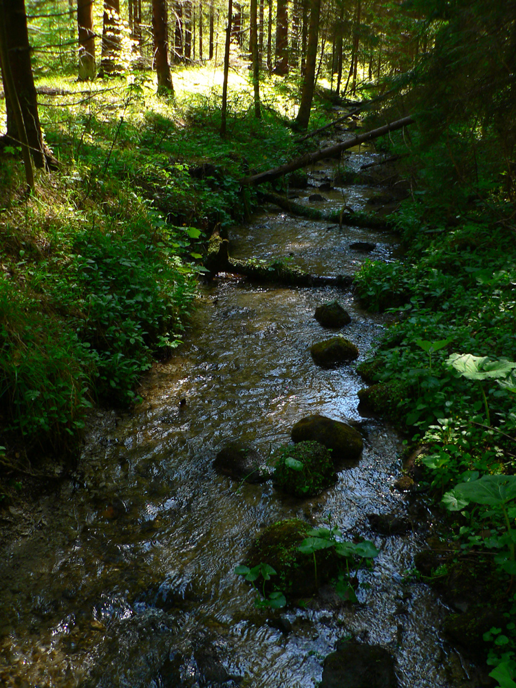 15 minút kľučkovania k rázcestníku, mením zelenú za modrú a začína zostup na Bartošku, krajinársky podobný výstupu. Čiže na úvod kľučkovanie strminou. Dookola stále viac machom obrastených balvanov, spod ktorých sa čoraz hlasnejšie ozýva zárodok potoka. Krátky úsek priamo cez žblnkotajúce pramenisko, no po prekrižovaní zvážnice je tu zrazu, akoby z ničoho, hučiaca riava.