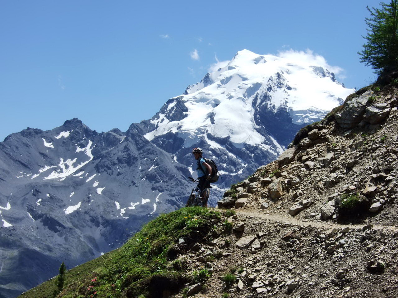 V závere stúpania tlačím, prechádzam popri rozostavanej chate a za slabého mrholenia a blížiaceho sa dunenia hromov sa púšťam po hrebeni chodníčkom, ktorý je dnes mojím hlavným cieľom - Goldseeweg. Počul som už o ňom z viacerých strán. V časopise sa rozplývali nad supertrailom a nedávno mi nemecký biker rozprával ako ten chodníček prakticky celý tlačil v opačnom smere "V prípade pádu riskuješ neustále svoj život!" asi taký bol jeho komentár. Tak a teraz som tu, aby som sa presvedčil na vlastnej koži. Búrka ma našťastie obchádza a dážď po chvíli končí. Môžem začať fotiť. Obraz si urobíte sami z fotiek, ale pozor! Fotil som sa sám ako už zvyčajne so samospúšťou a tak tie najťažšie miesta a množstvo úsekov, kde trebalo tlačiť na fotkách niesú.