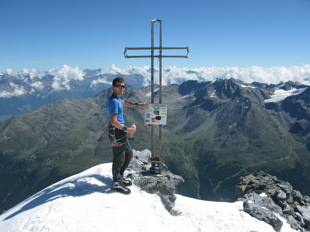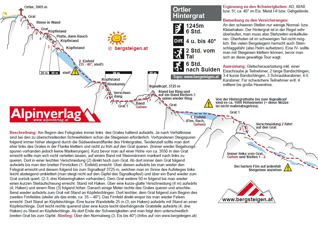 Hintergrat podľa Vetroplacha: štart o siedmej ráno zo Suldenu z parkoviska pri lanovke. Hintergrathutte za 1 hodinu a za ďalšie necelé tri hoďky vrchol Ortlera. Celkový čas 3h50min. V hornej časti som veľa fotil a v miestach pri Signalkopf som hľadal správnu cestu cca 10 min.