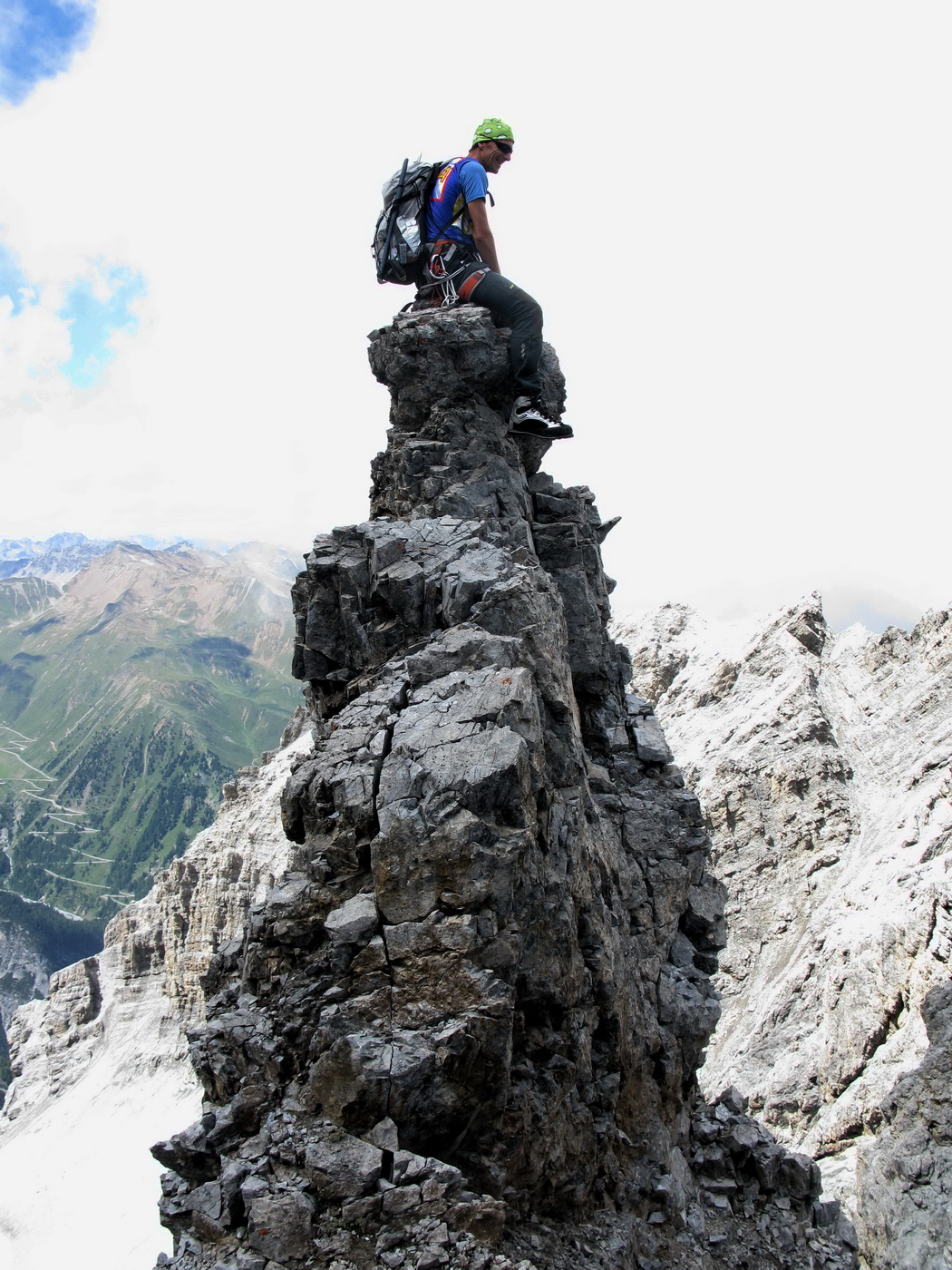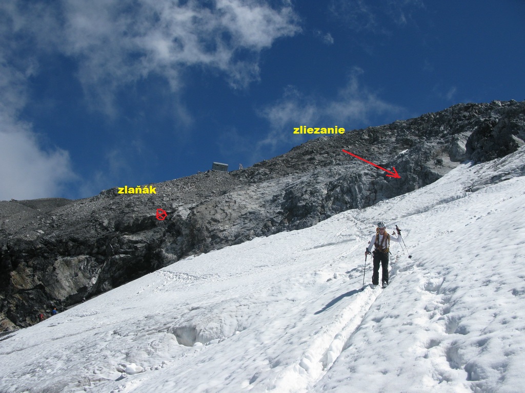 Tu pokračujete po ľadovci hore. Nie je to strmé. Išiel som to bez mačiek, ale závisí od podmienok. Ďalej sutinovým chodníčkom až pod výraznú vežu Signallkopf. Tu je prvé kľúčové miesto. Nenechajte sa nalákať na traverz vľavo dole pod vežou, ale pokračujte po hrebeni smerom hore. Pod vrcholom uvidíte výrazný zárez vľavo a ním treba zísť dole. Sú tam dva zlaňovacie kruhy, ale v prípade dobrých podmienok to nie je problém zliezť. Ďalej pokračuje traverz popod vežu naspäť na hrebeň. Toto bolo pre mňa orientačne najťažšie miesto. Aj keď som pred sebou nevidel žiadnych ľudí, pomerne rýchlo som to našiel.