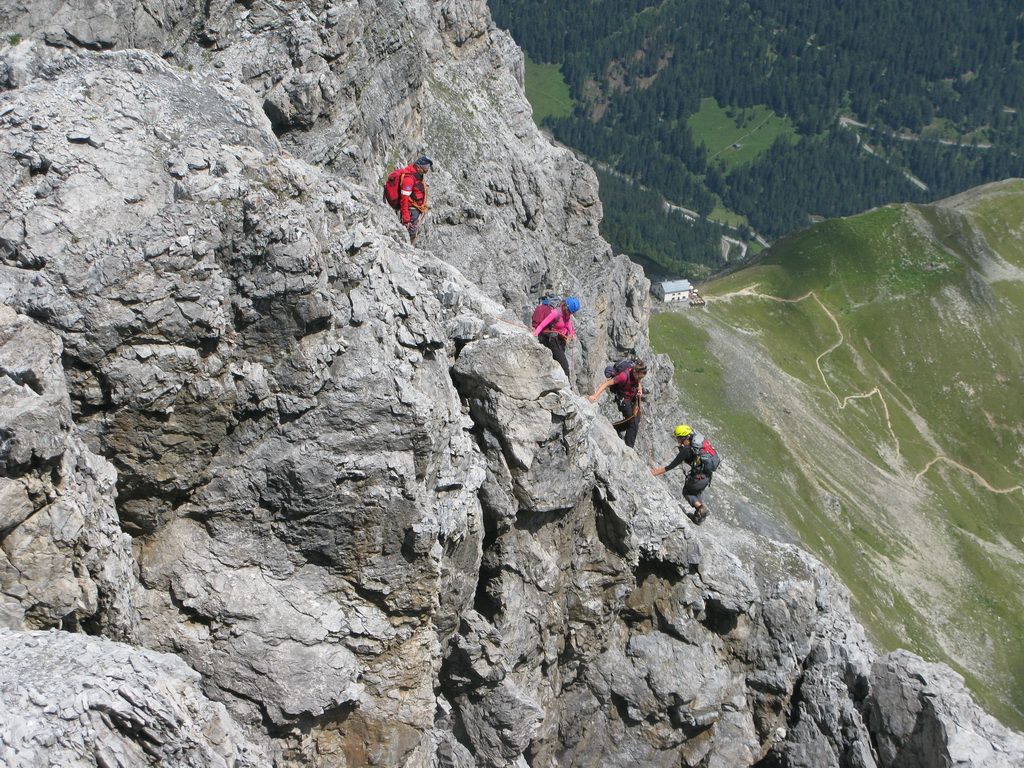 Tu sa dostanete na hrebeni ku kľúčovému miestu. Stienka so špárou obtiažnosti cca IV. V dolnej časti je zaseknutý friend, v strede zacementovaný nit a celkom hore nová strieborná reťaz. Expozícia nie je až taká strašná. Išiel som na istotu a preto som sa karabínou na dlhej sľučke cvakol do nitu. Doliezol som ku reťazi, chytil som ju jednou rukou, druhou som dočiahol nit a odcvakol karabínu. Vo vibramkách je to už také normálne lezenie, čiže skúsenosti s lezením sú potrebné.