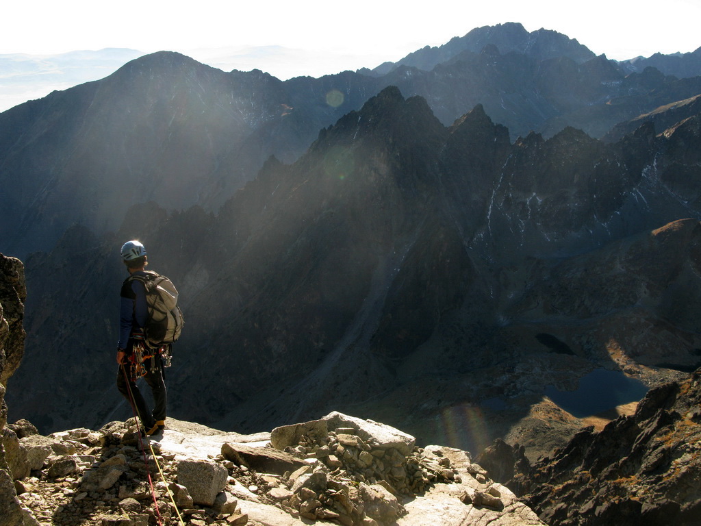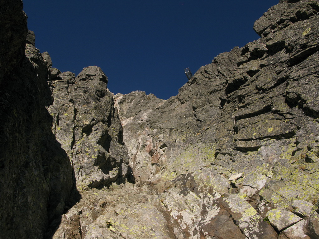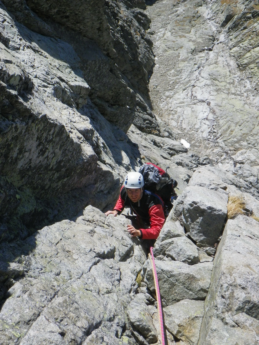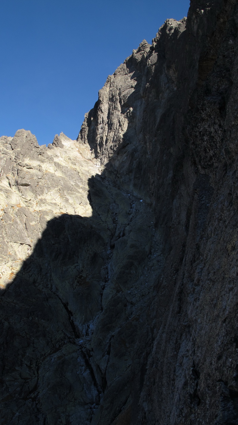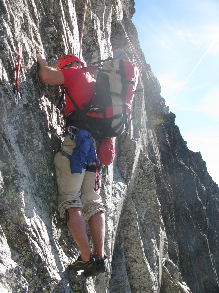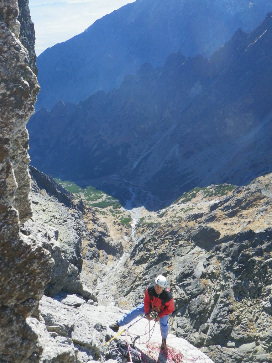 Do Téryho kuloáru sme zišli Gipsyho ferratou. Zdola akurát prichádzala trojka s batohmi. Zľakol som sa, že nás niekto predbehne, pridal som do kroku a s náskokom obsadil nástup. Chýr o zápche v tejto ceste je veru zlý. My sme si dnes nemohli nejaké zdržovanie dovoliť.