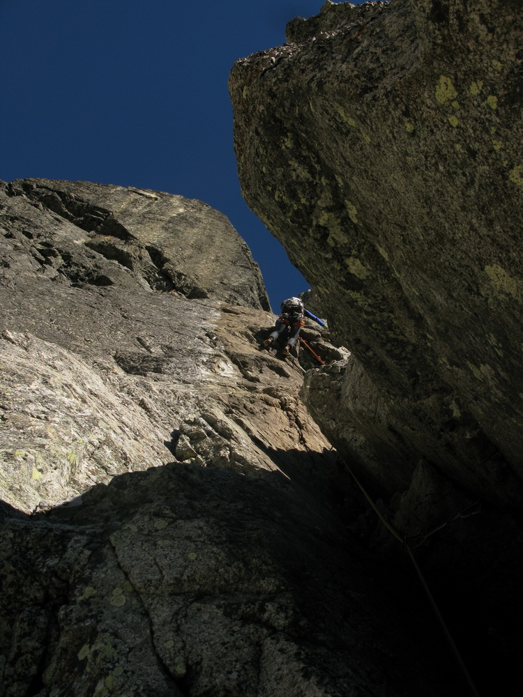 Tretia dĺžka je pekný päťkový komínčok. Na štande sa stretávame a za družnej debaty fotíme Peťa, ktorý prvý lezie do traverzu. O ňom som už nejaké tie útržky počul. Stano s batohom krúti hlavou. Peťo mu nezapol jednu skobu, ako tak rýpal hore, a on chudák ako druhý sa v tom traverze na lano spoľahnúť nemôže :))