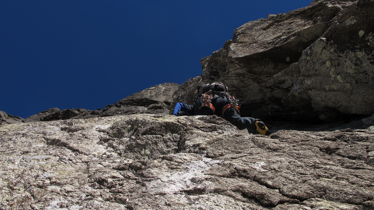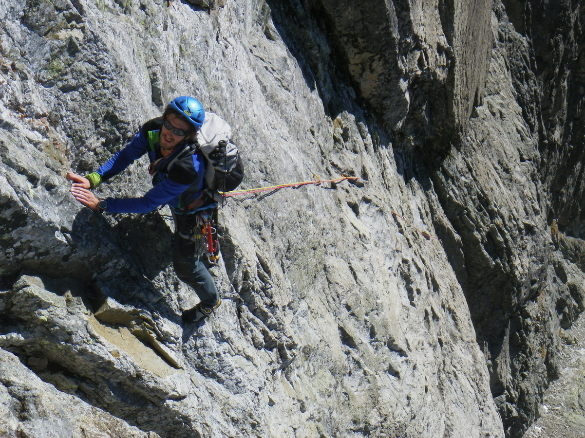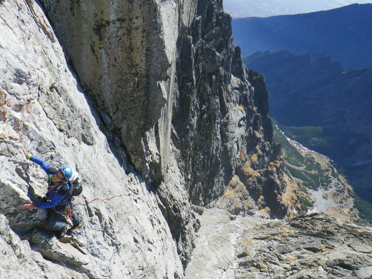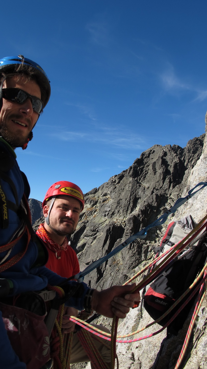 Je rad na mne a na vlastnej koži sa presviedčam, o čom je ten traverz. Pri tých pár krôčkoch po relatívne dobrých stupoch, ale žiadnych chytoch sa pokúšam škrabkať nechtami po skale. Som na štande a rad je na Matúšovi. Nevidím ho, lano sa po chvíli zastaví. Skúšam dobrať, nehýbe sa. Dlho sa nehýbe. Nevidím ho. Počujem ho. Nahlas ho počujem. Veľmi nahlas ho počujem:)