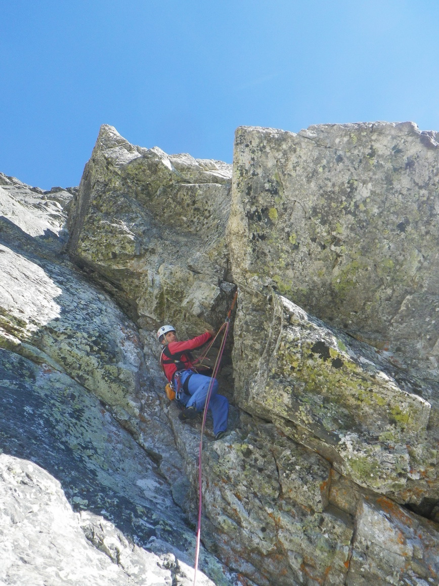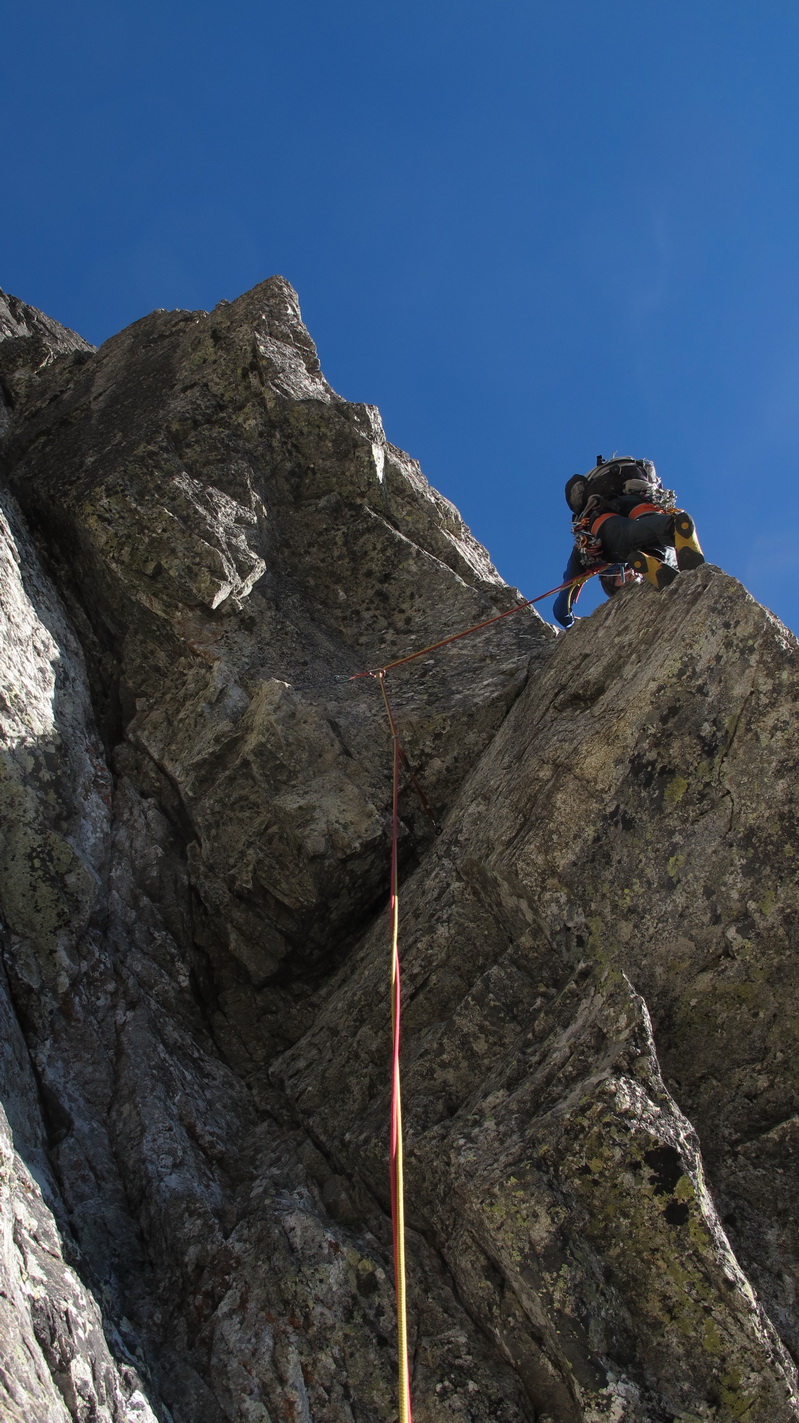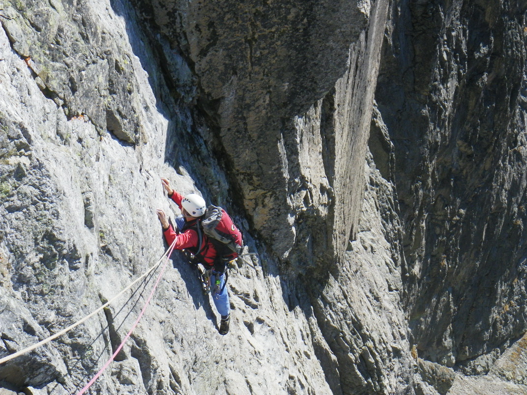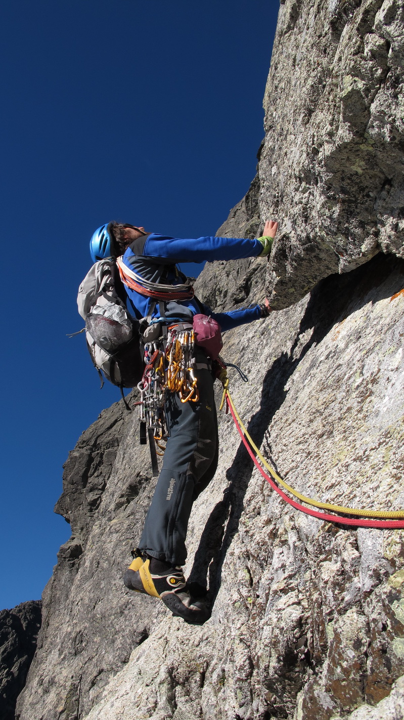 Je rad na mne a na vlastnej koži sa presviedčam, o čom je ten traverz. Pri tých pár krôčkoch po relatívne dobrých stupoch, ale žiadnych chytoch sa pokúšam škrabkať nechtami po skale. Som na štande a rad je na Matúšovi. Nevidím ho, lano sa po chvíli zastaví. Skúšam dobrať, nehýbe sa. Dlho sa nehýbe. Nevidím ho. Počujem ho. Nahlas ho počujem. Veľmi nahlas ho počujem:)