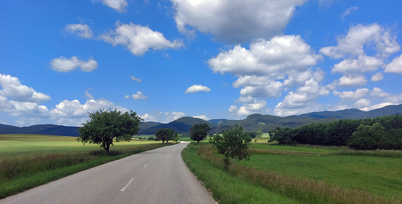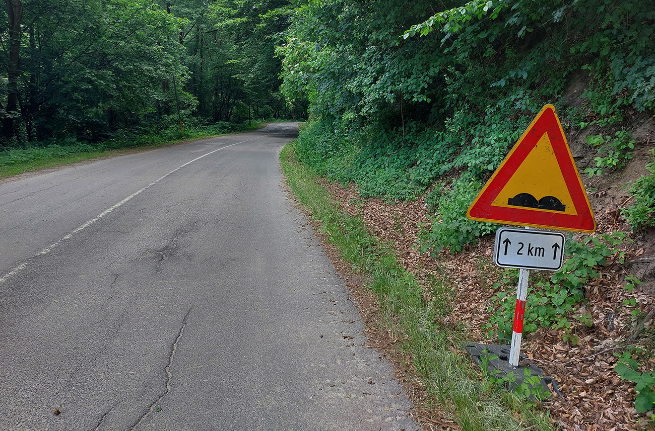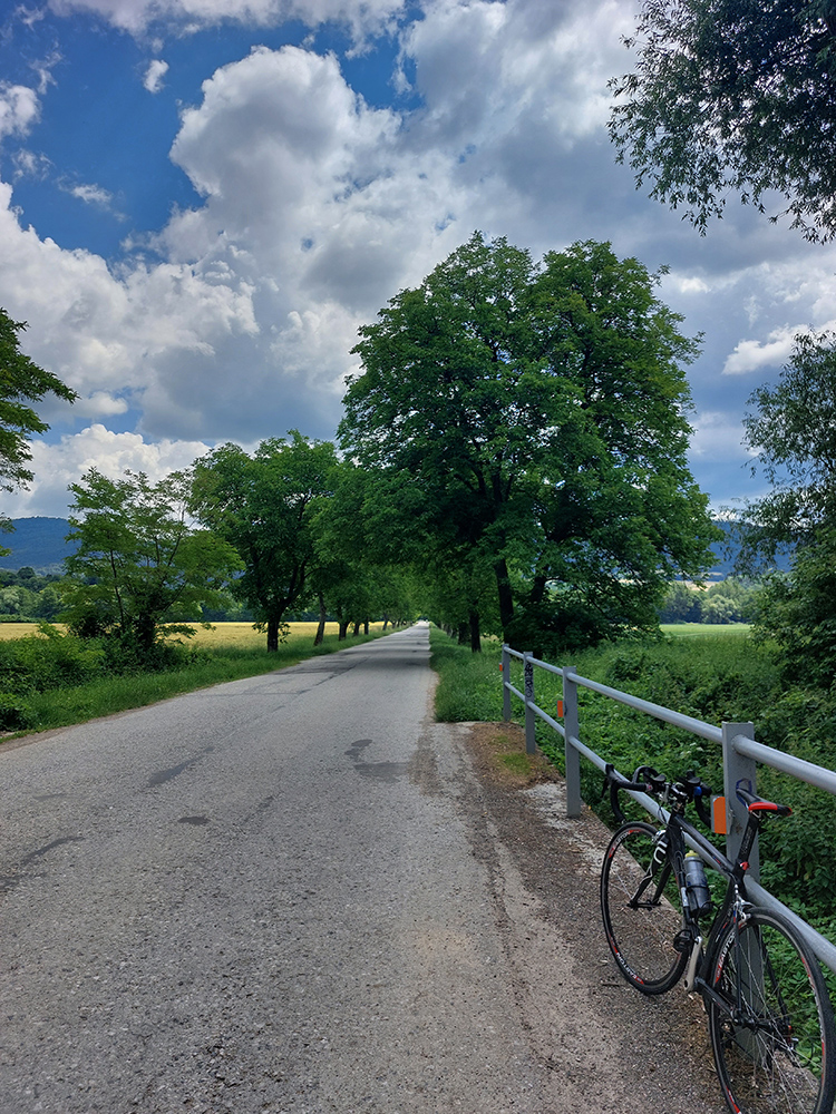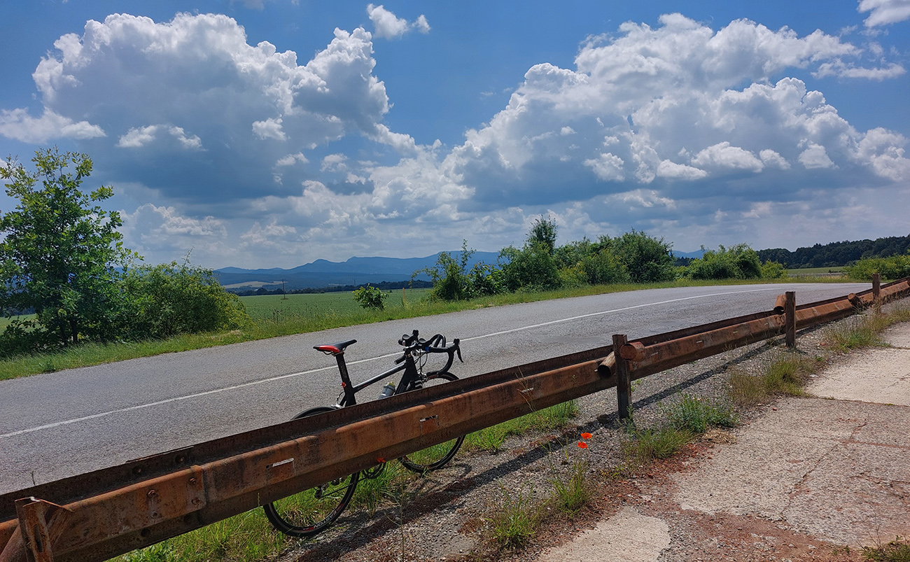 Začiatok zjazdu ako vždy čistá hrôza a intenzívne brzdenie, lebo hra svetla a tieňa tu perfektne maskuje početné diery v asfalte. Navyše tu aj popršalo, cesta mokrá, viac čierna ako za sucha. Ale s vynorením z lesa už pohoda až domov – lebo z kopca, po hladkom a navyše s vetrom do chrbta, no čo viac chcieť na záver?