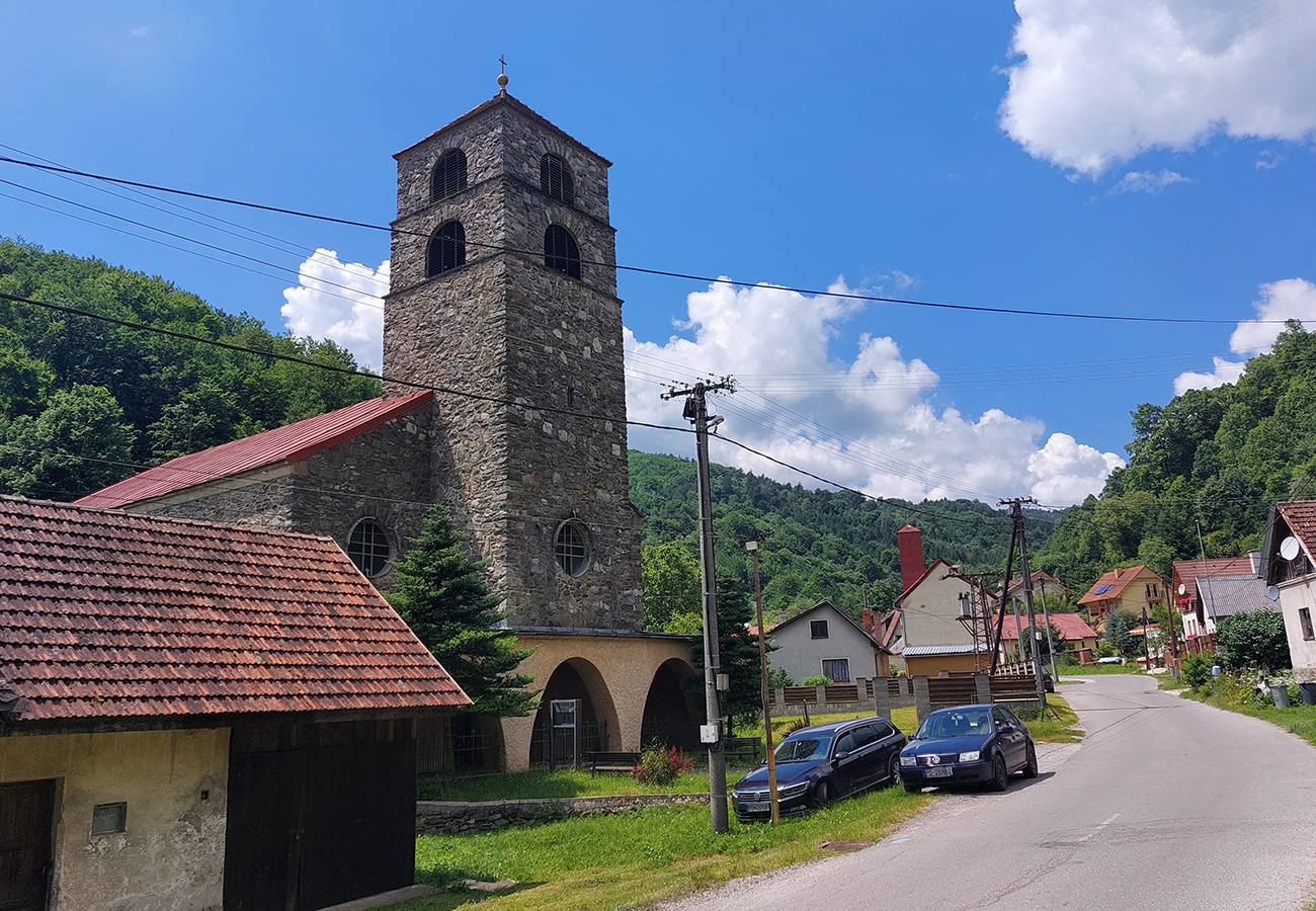 Nazad na námestí v Pravne som usúdil, že som asi v polovici výletu, tak som lupol dvojitú čokoládovú, povystieral nohy a staré kosti a išlo sa ďalej. Na programe bola Chvojnica, najdlhšie rameno hviezdice. A ako som rýchlo zistil, aj najviac do kopca. Na úvod sa cesta trochu vlní hore a dole, potom sa vlní už len hore, miestami aj celkom výživne. Ale v krátkych striedačkách s miernejšími úsekmi. Chvojnica je typická kolonizačná dedina, zavrznutá v úzkej doline, takže poriadne natiahnutá a s medzerami medzi domami. Len okolo svojrázneho kostola je to v jej jadre trochu hustejšie zastavané. Netreba sa dať odradiť hrboľatou značkou pred vjazdom do „centra“ ani kusom poriadne rozbitého asfaltu za otočkou autobusu na hornom konci. Dobrá cesta pokračuje hneď za horizontom, za ktorý zdola nevidno, pomedzi chaty až k horskému hotelu Magura. Tesne pod ním som sa otočil, lebo sklon už začínal naberať neslušné hodnoty. A cestou nazad, práve pri tom rozbitom kúsku cesty, som zase dotankoval z fajného prameňa: