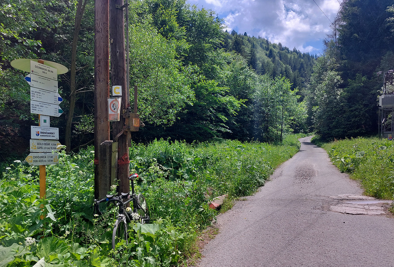 Posledná dvojsmerka tam aj nazad ma viedla do Tužiny. Tam to už poznám z výjazdov do srdca Strážovských vrchov, takže len tak pre úplnosť. Na začiatku trochu výhľadov z kopca, potom poplátaný, ale relatívne hladký, dlhý prejazd dedinou. Dolná krčma, horná krčma, medzitým cukráreň, ale nestál som. Ani som to nehrotil za dedinou po rozbitom úseku (za ktorým sa podklad ale zlepší) ďalej do doliny, otočil som to hneď za posledným domom pri kríži a ponáhľal sa nazad do Pravna na druhú dávku kalórií, tentokrát vanilkových. Za Euro kopček.