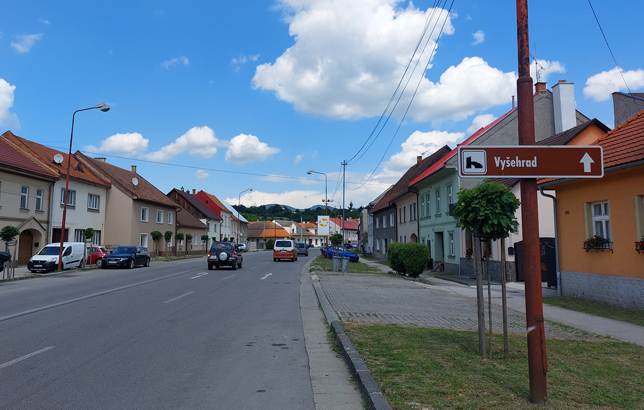 Malinová, ďalší cieľ. Z kopčeka pred dedinou pekné výhľady na hrebeň Vtáčnika aj s oboma Gričmi na jeho začiatku. Cesta pre zmenu poriadne široká. Malinová je po nemecky Zeche a je tam peruánska reštaurácia, no ci beka! Ale aj tadeto tiahne cyklotrasa a nejako veľa bajkov tam bolo poopieraných, tak som potiahol ešte kus vyššie, zase popri kaplnke, po žltej značke za/nad dedinu. Príjemná, hladká, mierne stúpajúca, úzka cezpoľná asfaltka, len občasné nánosy piesku z polí na nej. Pri vodojeme asfalt skončil akoby uťal, ale výhľady na všetky okolité veľhorstvá parádne, kruhové. Nazad dole v ústrety Vyšehradu: