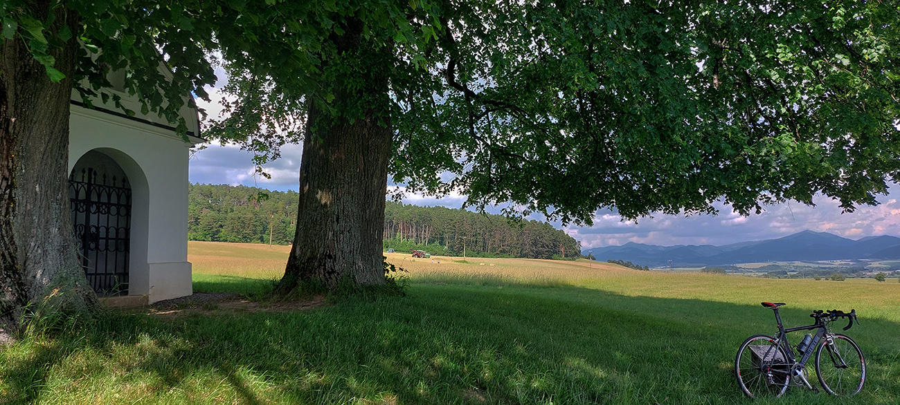 Ďalší na programe bol Pravenec, ale tiež nie po hlavnej. Cez Solku. Ako som sa vymotal spomedzi domov a premostil Tužinku, už tu bola cesta krásnou gaštanovou alejou a naľavo svietil na kopci kalvársky kostol. V Solke pri kaplnke doprava a popri cintoríne (cestou nazad som tam dotankoval) vedie do Pravenca pekná, hladká, aj keď úzka cestička. Ale aj cyklotrasa je to. Na konci dediny som sa otočil, aby som nazad do Pravna nešiel po hlavnej, a nazad ma navigoval zase ten biely kalvársky kostolík, svietiaci zo zeleného pahorka: