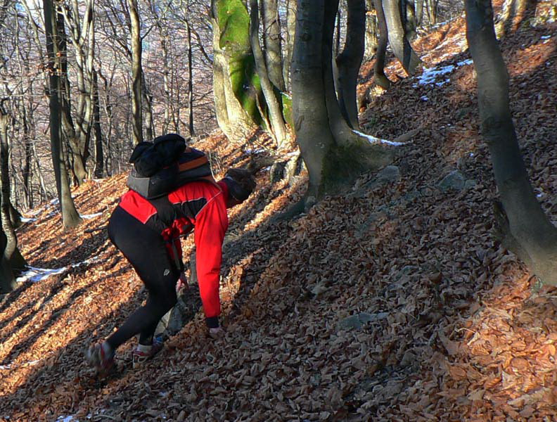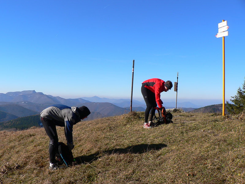 Na Hnilickej Kýčere už ich vidno pred nami, to však netušíme že je to síce krátka vzdialenosť, ale v tej brutálnej stojke na dooooosť dlhý čas. Mazľavé blatko pod vrstvou lístia nás posiela pekne na všetky štyri, krok vpred, meter nazad. Ešte aj v sedle Majbliková nás čakajú, dobiehame plní nádeje – aha tam sa v kríkoch krčia, grcajú! Nič z toho, to bol vraj len strečing, vraj z dlhej chvíle, tssss.